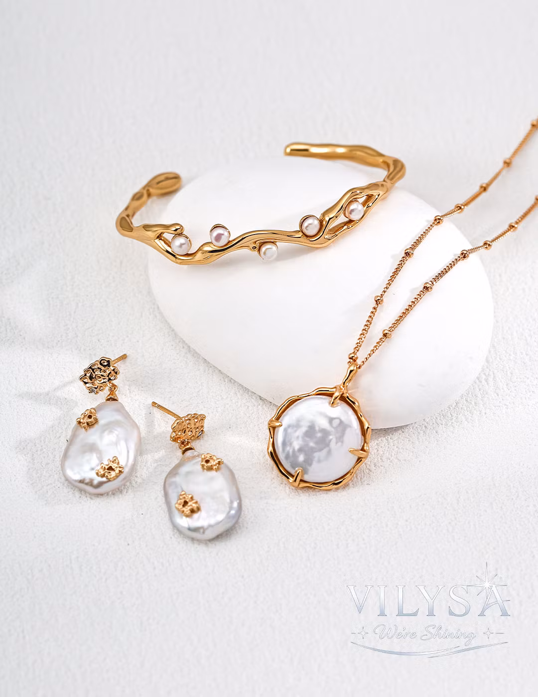 Each baroque pearl is selected for its distinctive character—variations in shape, size, and iridescence are cherished features of natural beauty. The molten-textured settings are precisely finished to complement, not overshadow, the organic irregularity of the pearls they hold.