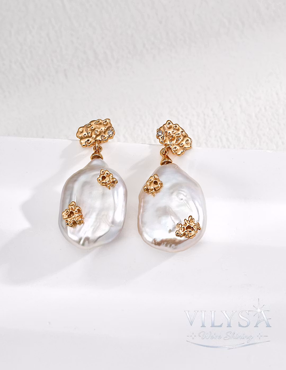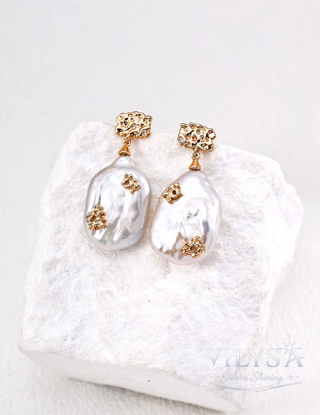 These striking drop earrings celebrate the quiet poetry of imperfection. Each earring features a large, irregular baroque pearl—its surface alive with a lustrous, iridescent sheen that shifts between cream, silver, and whispers of rose. No two pearls share the same form; each is a singular expression of nature's spontaneous artistry.