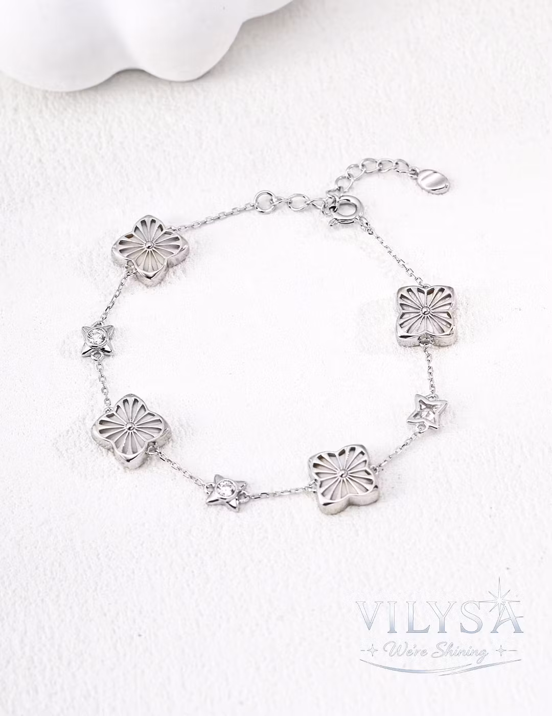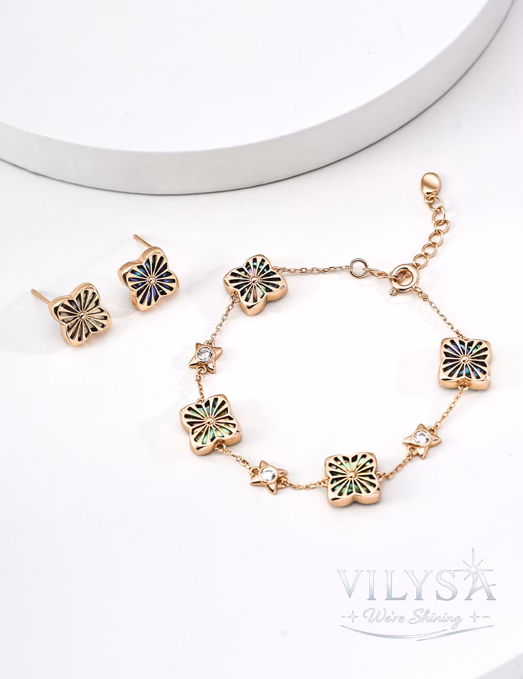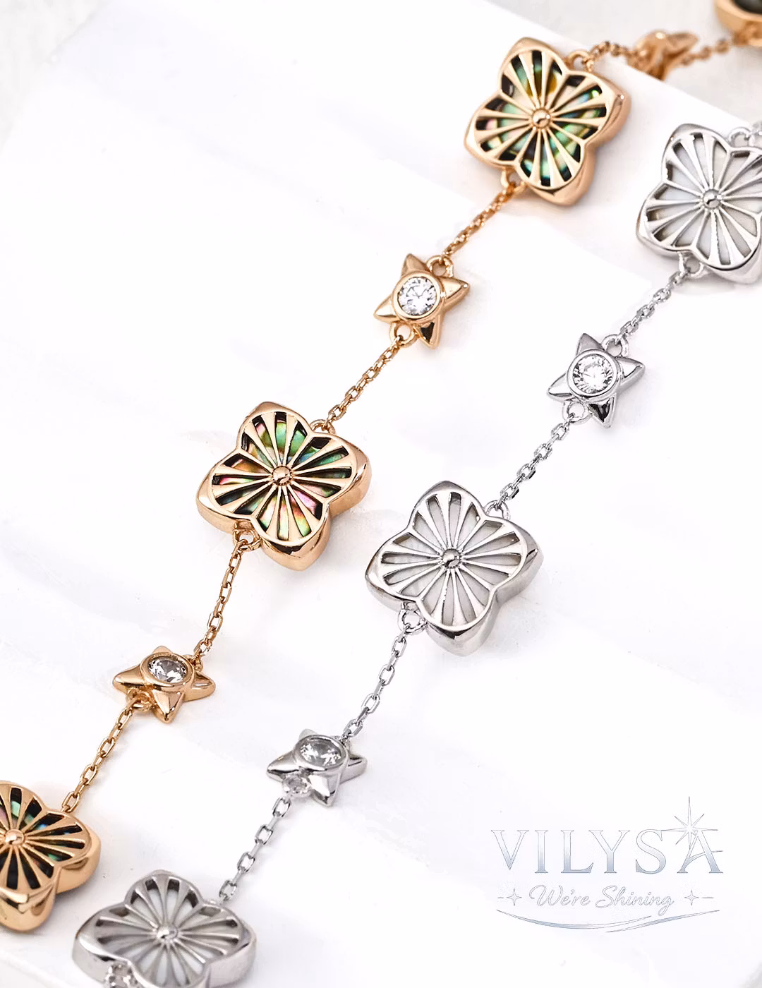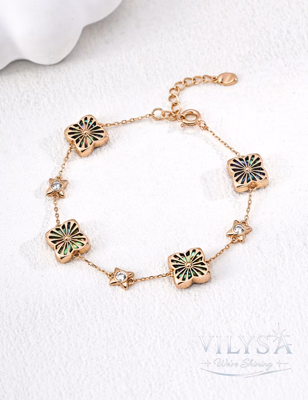 This adjustable bracelet weaves together two timeless symbols of light and luck. Along its delicate chain, four symmetrical four-leaf clover charms—each inlaid with either iridescent abalone shell or luminous white mother-of-pearl—unfold in a delicate radiating pattern at their center. Scattered between them, sparkling cubic zirconia stars add a touch of celestial wonder, as if catching stardust among the clovers.