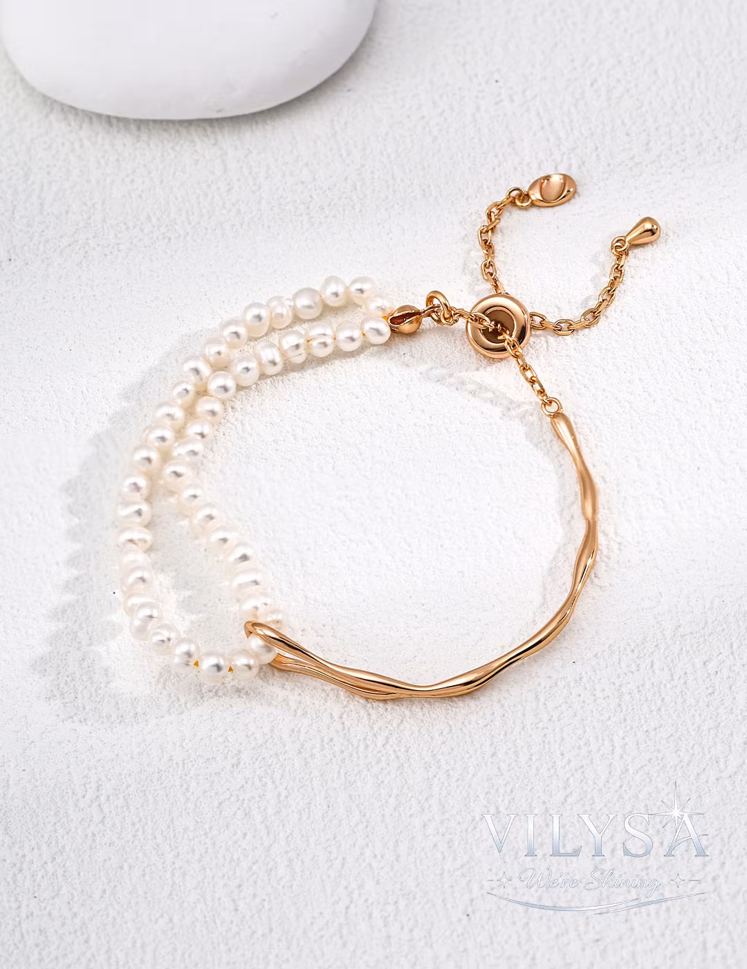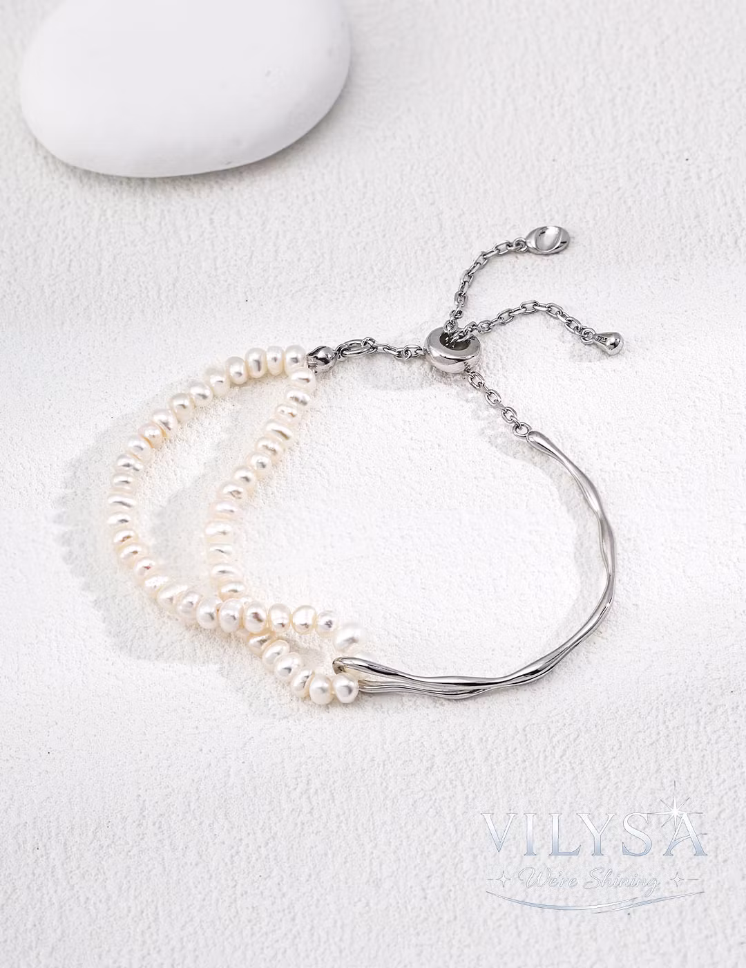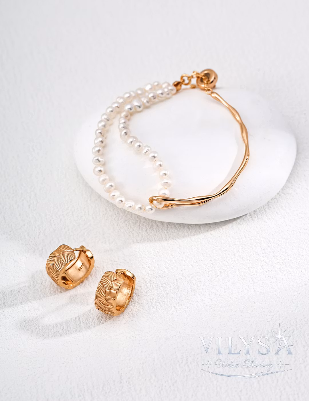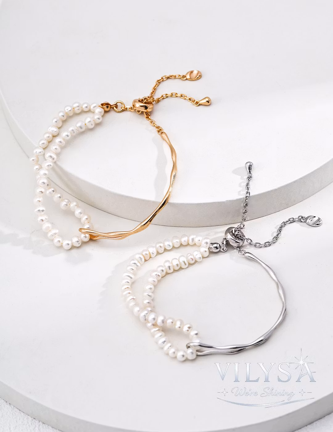 ・Design: Two-layer (sculpted bangle + pearl strand)
