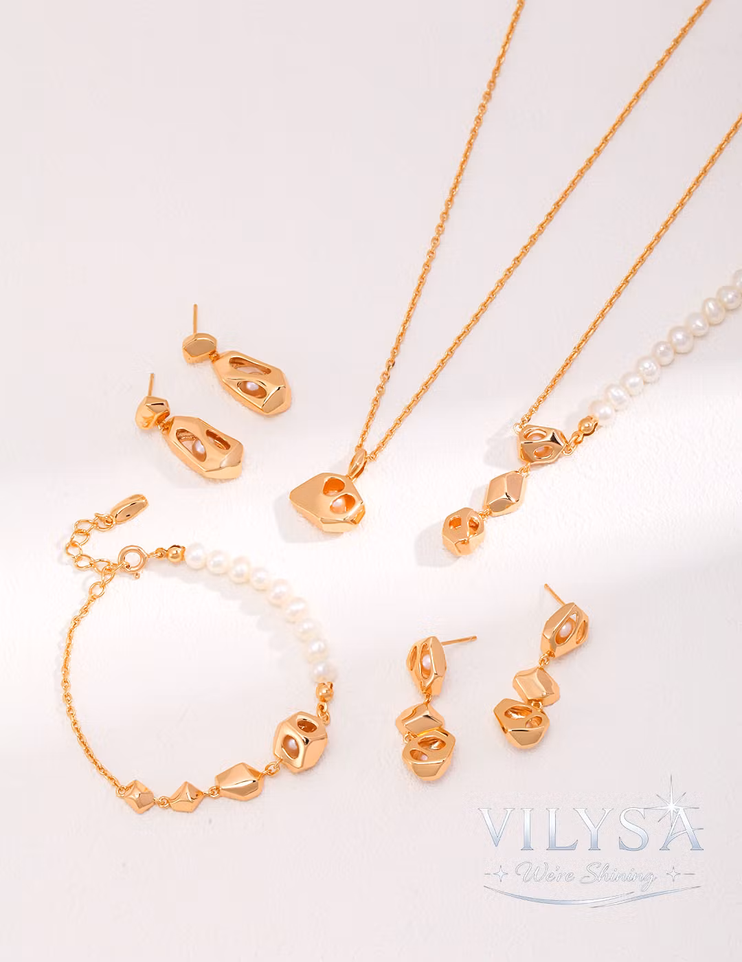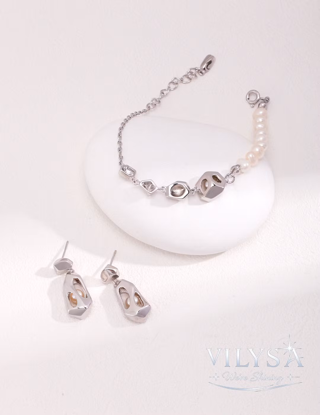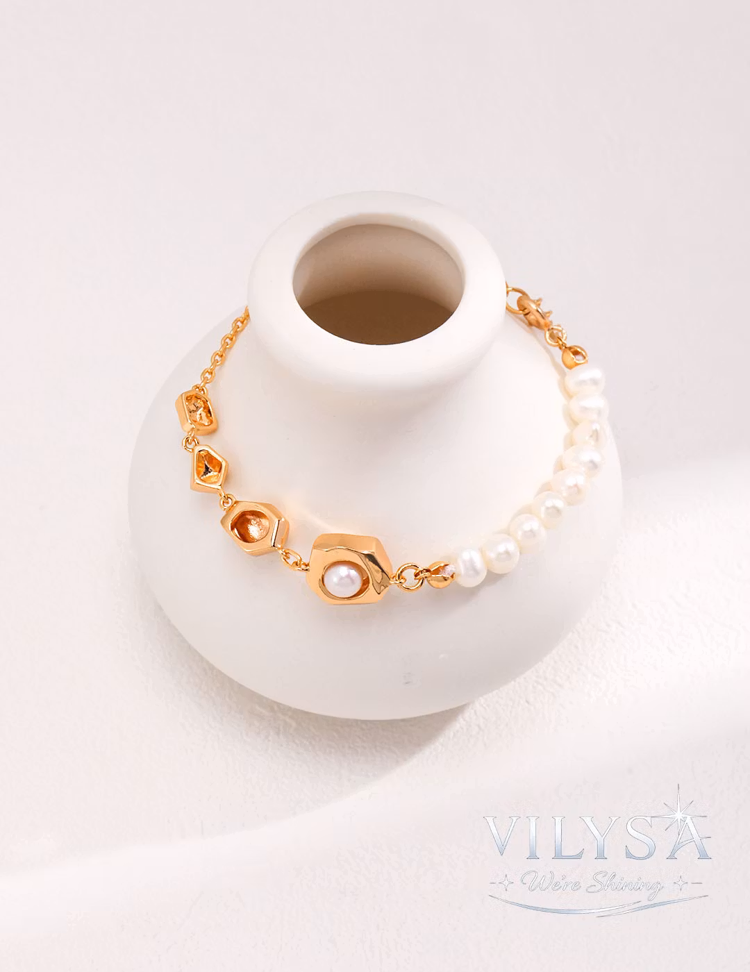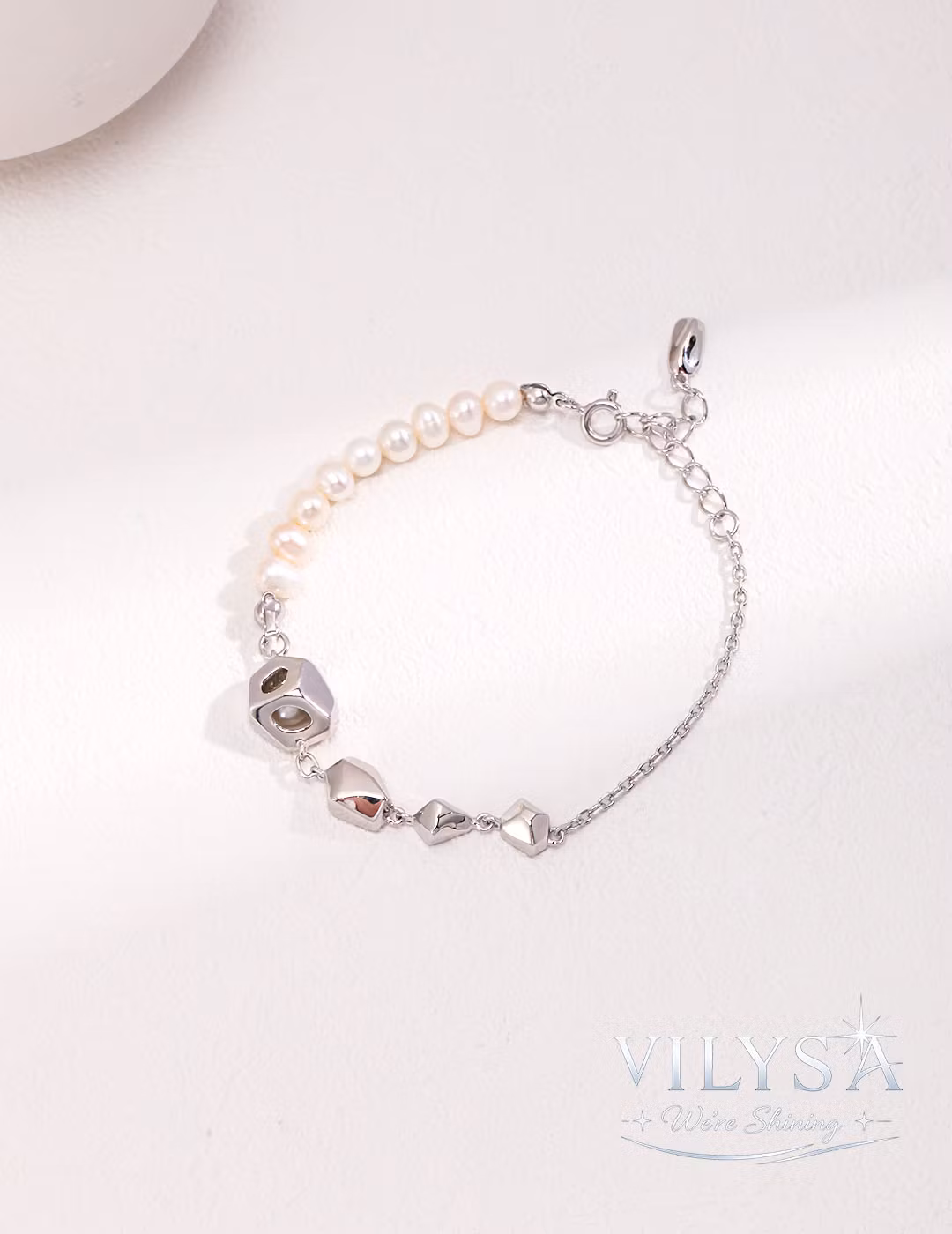 This modern bracelet artfully blends a strand of natural pearls with geometric, faceted sterling silver beads. The design plays with a compelling contrast: the soft, organic luster of the pearls meets the sharp, polished angles of the metal, resulting in a dynamic and distinctly contemporary aesthetic.