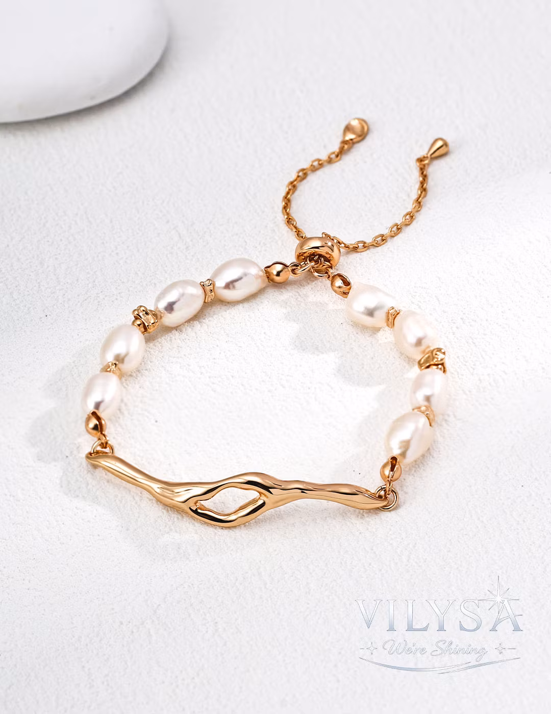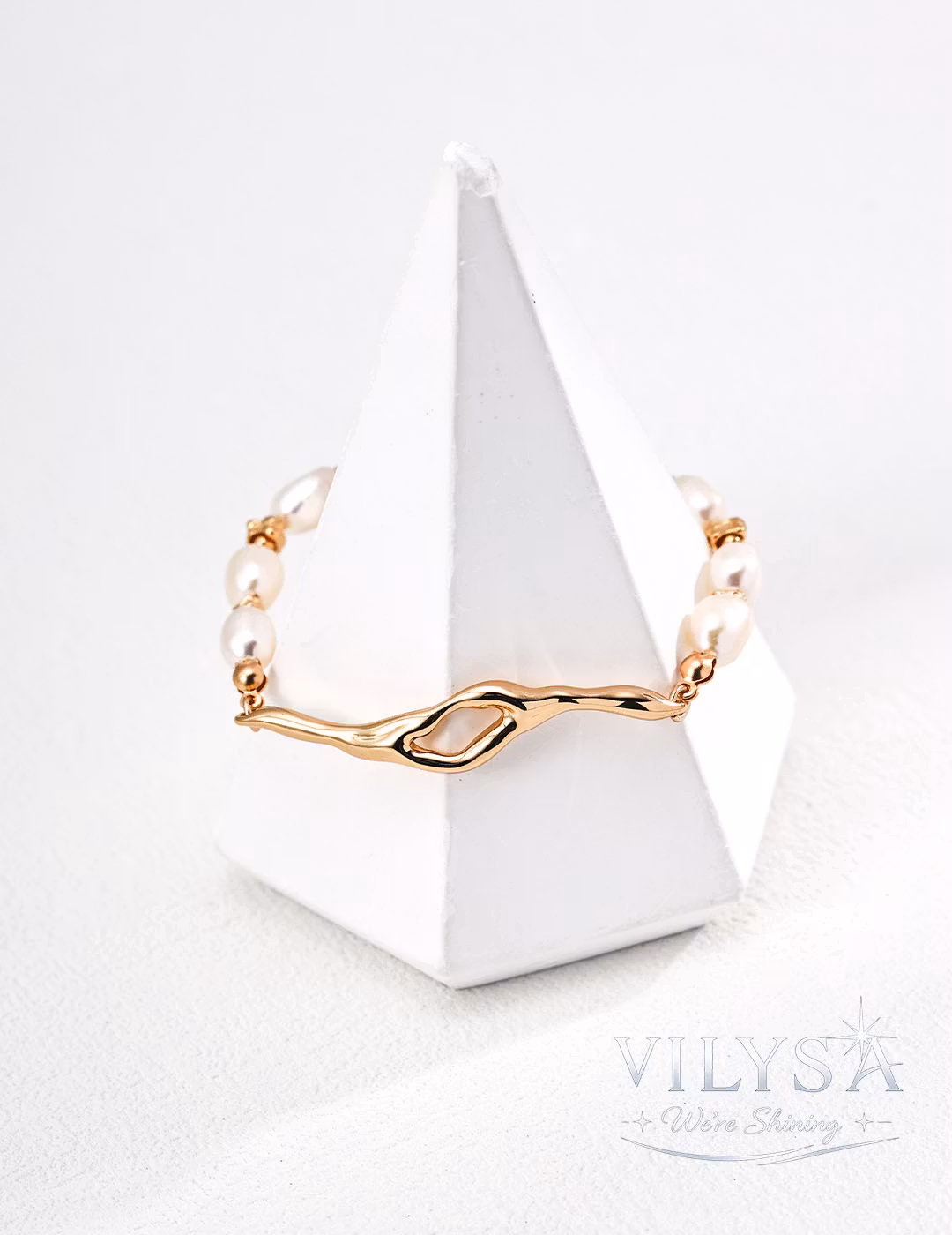 This bracelet features a bold, fluid centerpiece sculpted to mimic the dynamic flow of molten rock. This modern, organic form is artfully contrasted with a strand of smooth, elongated natural freshwater pearls, creating a sophisticated fusion of raw energy and timeless elegance.
