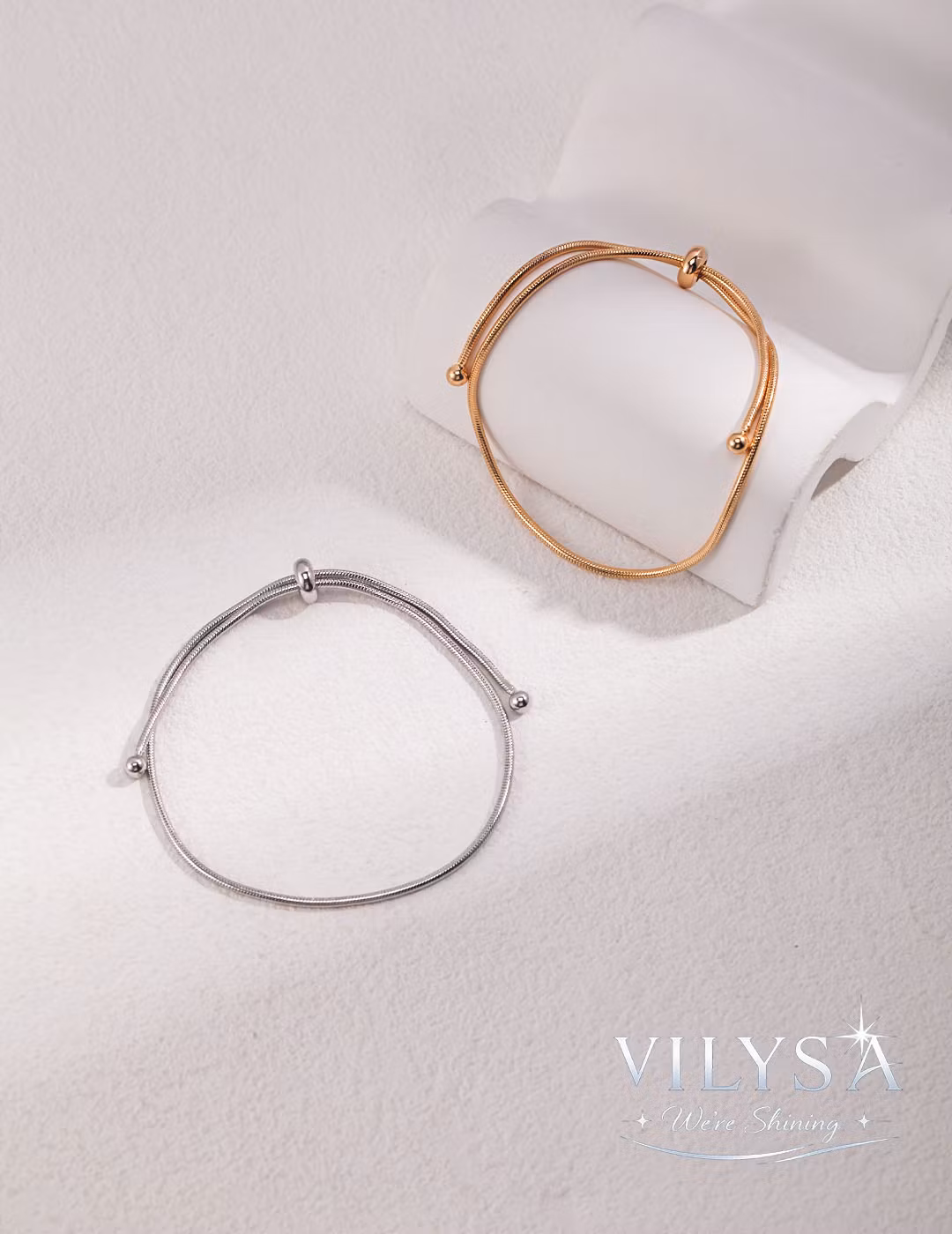 This bracelet is a study in quiet sophistication, where simplicity becomes its own statement. A sleek, snake-like chain flows with fluid grace—its polished surface catching light in a continuous, understated shimmer. At its heart, a smooth sliding bead moves effortlessly along the band, allowing you to adjust the fit with a single, intuitive gesture.