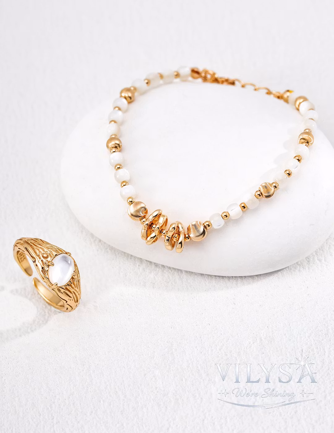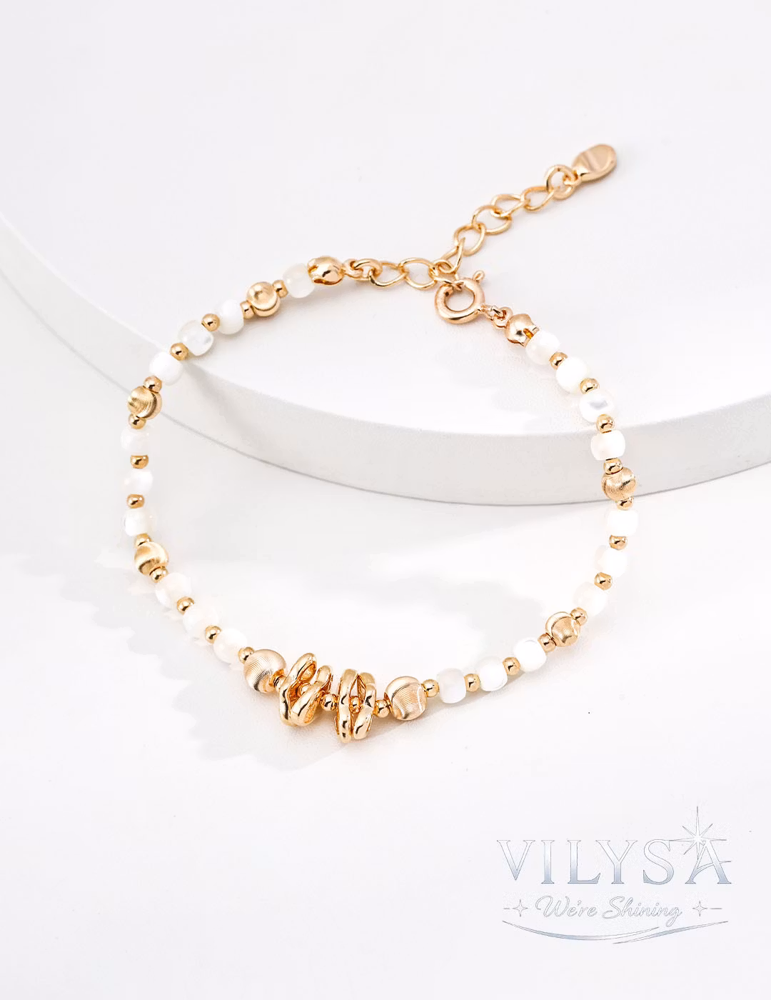 Hand-strung with precision. Each mother-of-pearl bead is unique in its iridescent play of light, ensuring your bracelet carries a subtle, one-of-a-kind glow.