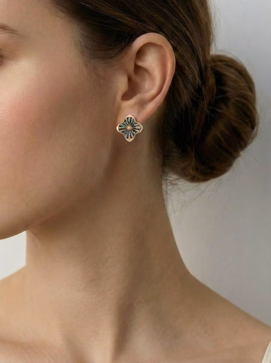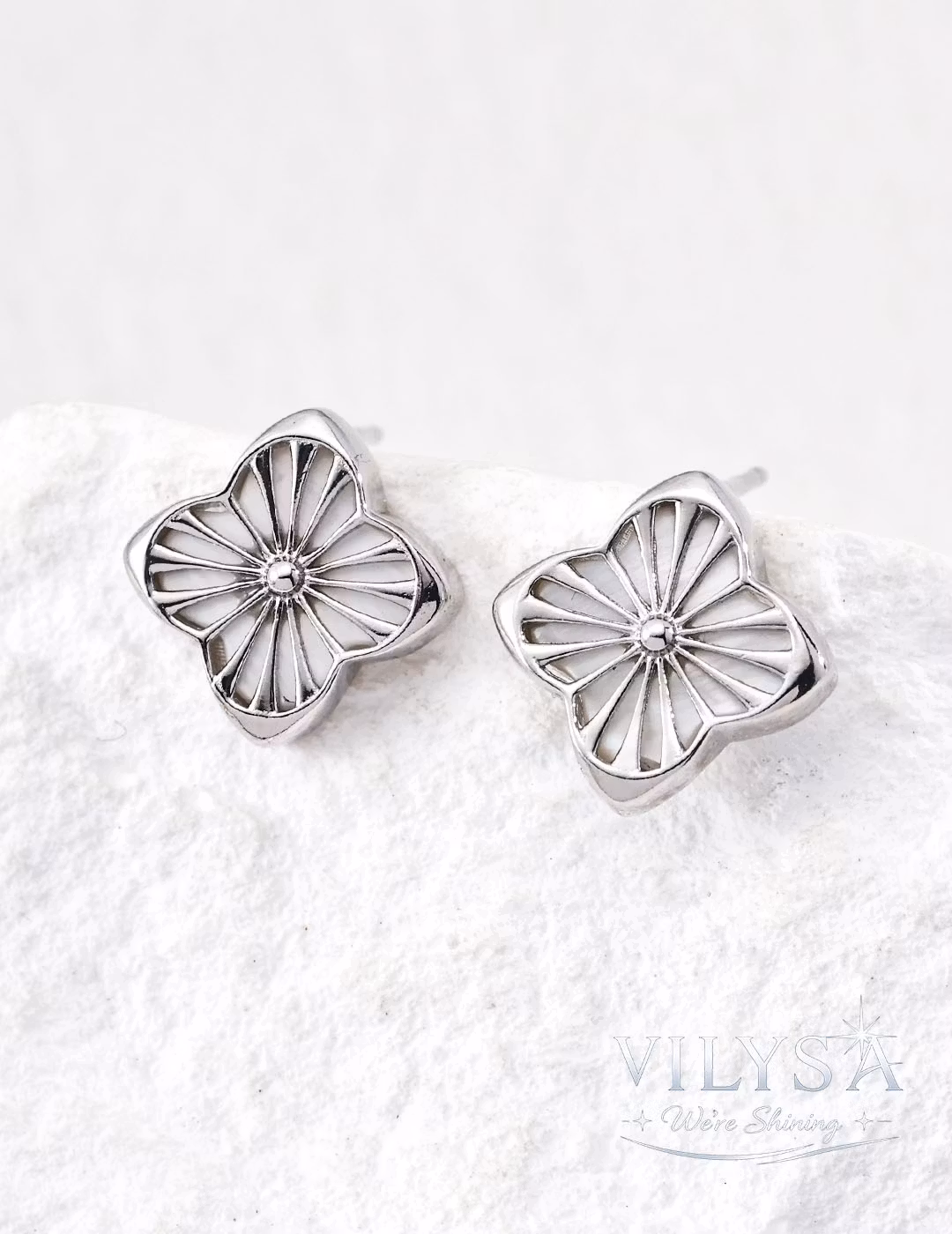 These elegant earrings are defined by a symmetrical four-leaf clover silhouette, a timeless emblem of luck and grace. At their center, a delicate radiating pattern frames your choice of either iridescent abalone shell or luminous white mother-of-pearl, whose natural shimmer shifts softly with the light. The smooth, polished metal frame enhances the shell’s organic glow, creating a design that is both sophisticated and quietly eye-catching.