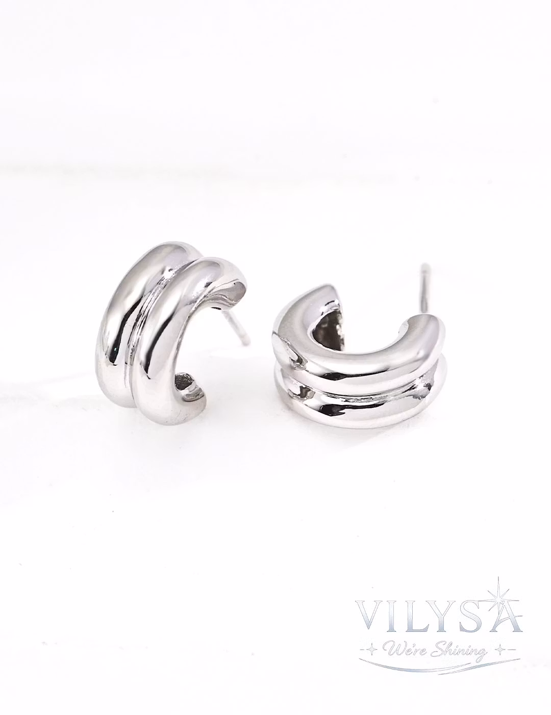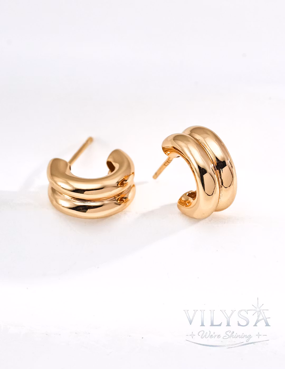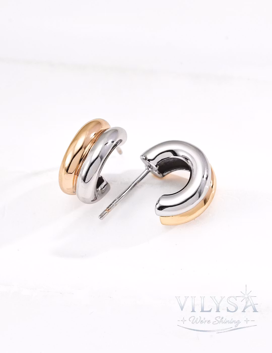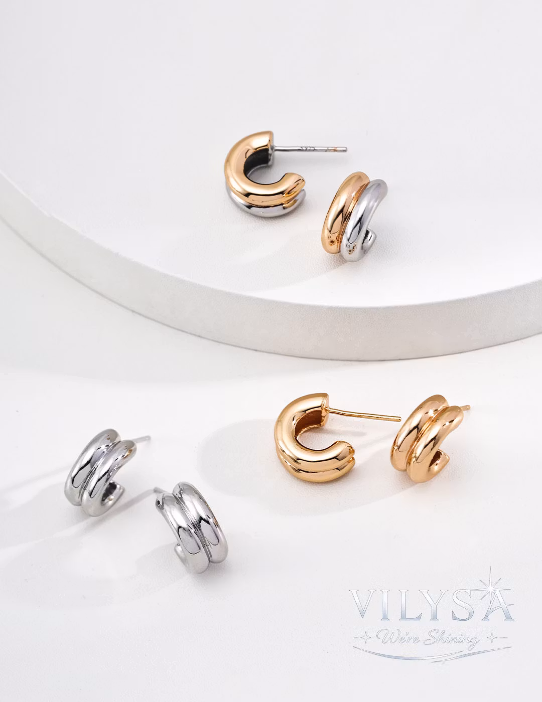 These modern earrings feature a sleek double-hoop silhouette, crafted from smooth, polished S925 sterling silver. The clean, sculptural lines offer a contemporary take on a timeless classic, available in three refined finishes: warm antique gold, cool white gold, or a striking two-tone combination of both.