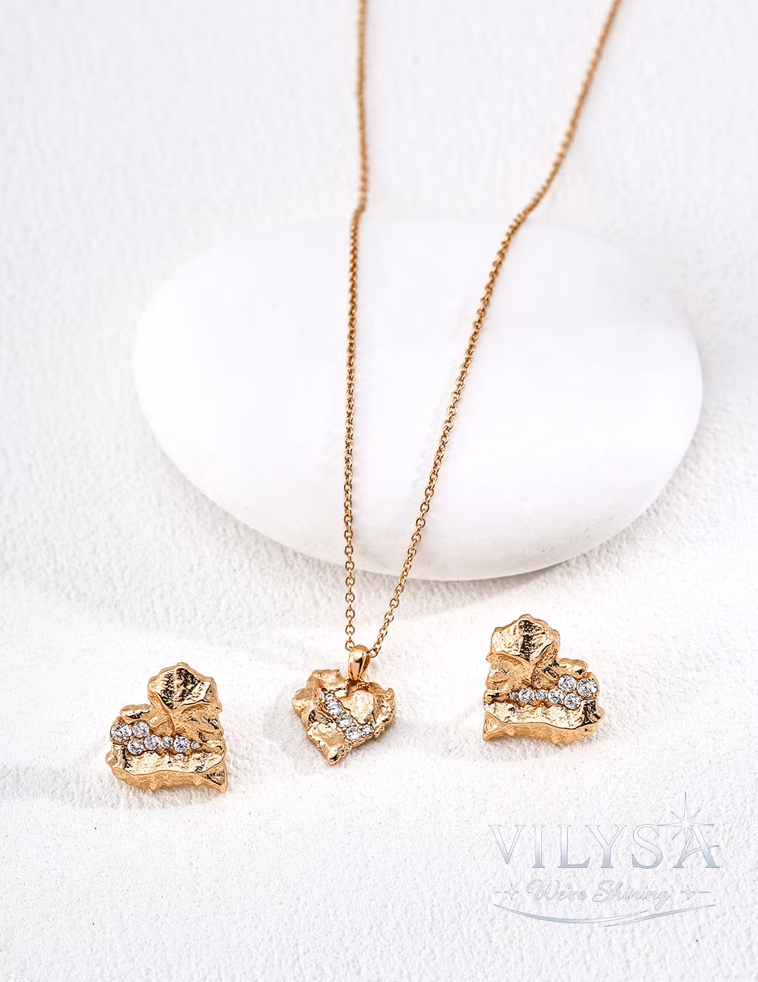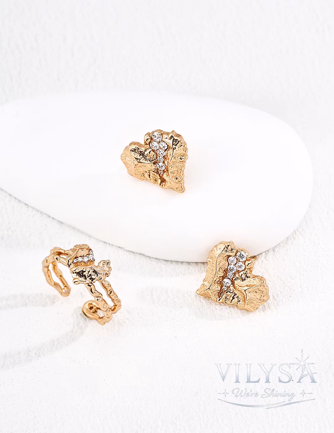 Inspired by the raw, weathered beauty of natural rock, this heart-shaped design is both understated and profoundly distinctive. Its surface is etched with stone-like cracks and fissures, each line a testament to time and transformation. Nestled within these textured crevices are sparkling cubic zirconia—like gemstone crystals formed slowly, patiently, over millions of years.