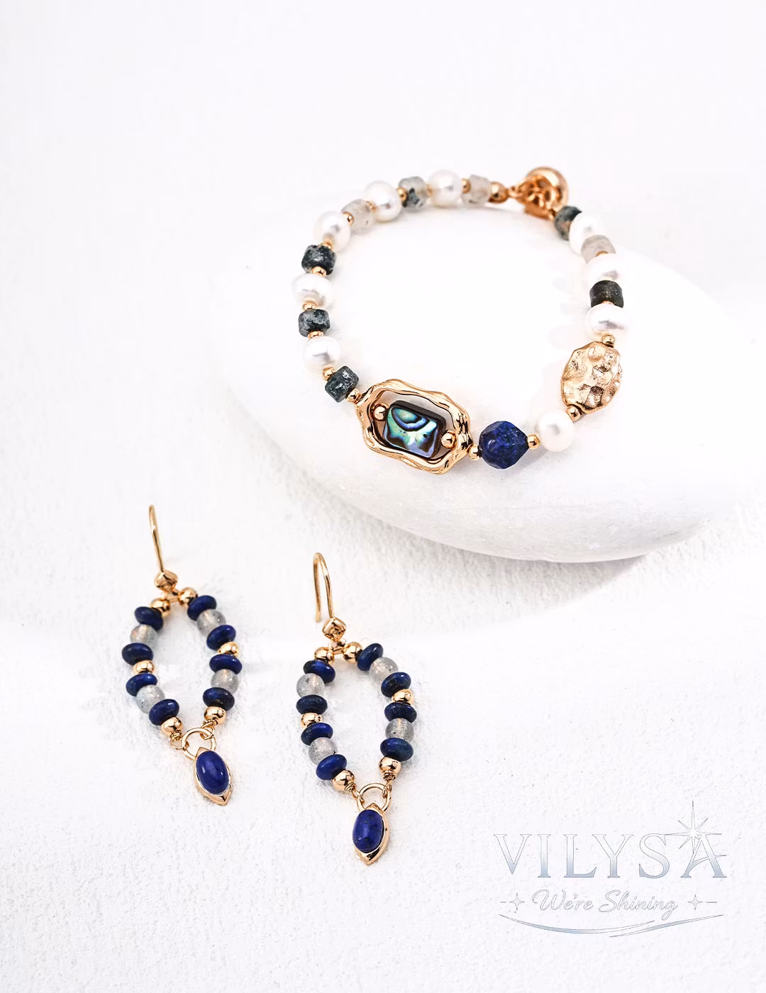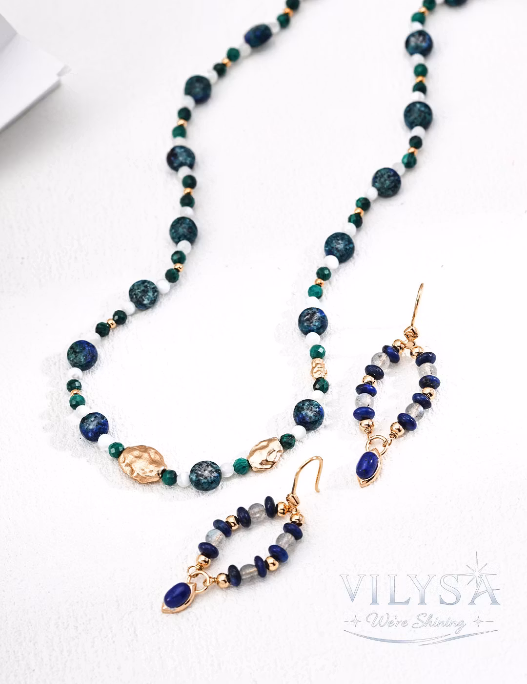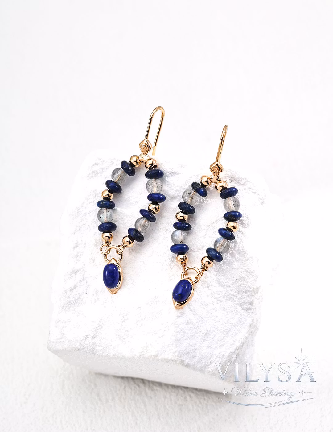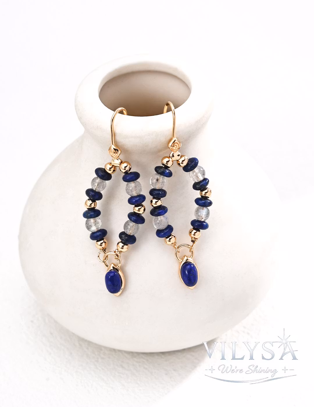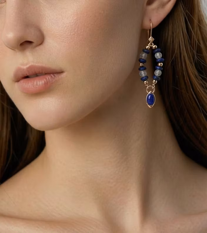 These elegant drop earrings feature a delicate cascade of iridescent grey moonstone chips and deep royal blue lapis lazuli beads, culminating in a smooth, elongated lapis lazuli cabochon. Hand-strung with intention, the design captures a serene dialogue between the moonstone’s ethereal glow and the lapis lazuli’s rich, celestial depth.