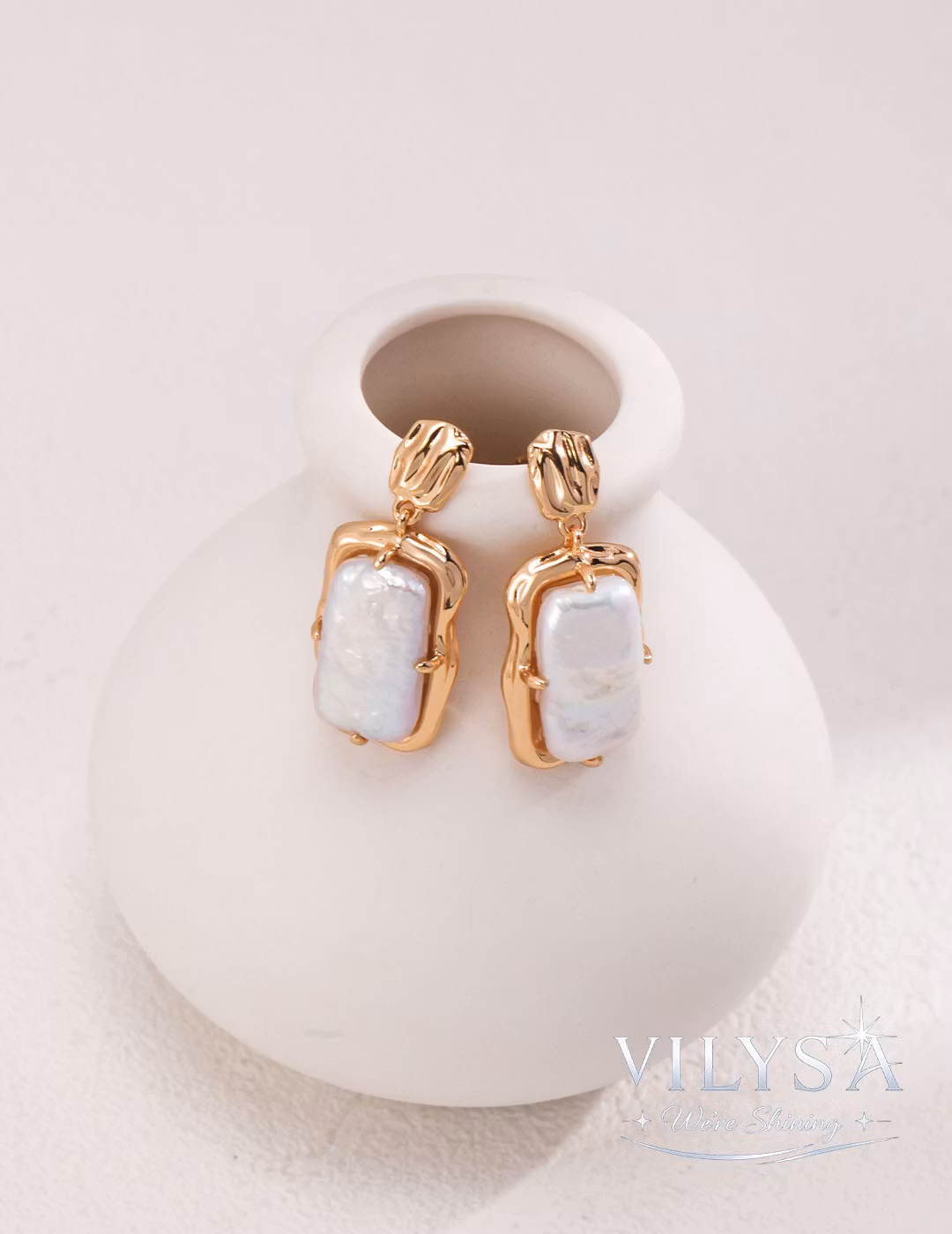 These earrings are a canvas for nature's quiet artistry. Each large, rectangular baroque pearl—with its soft, iridescent luster and uniquely organic texture—is cradled within a sculpted frame of warm antique gold. The metal flows in fluid, organic lines that echo the pearl's natural form, as if shaped by the same gentle forces of time and tide.