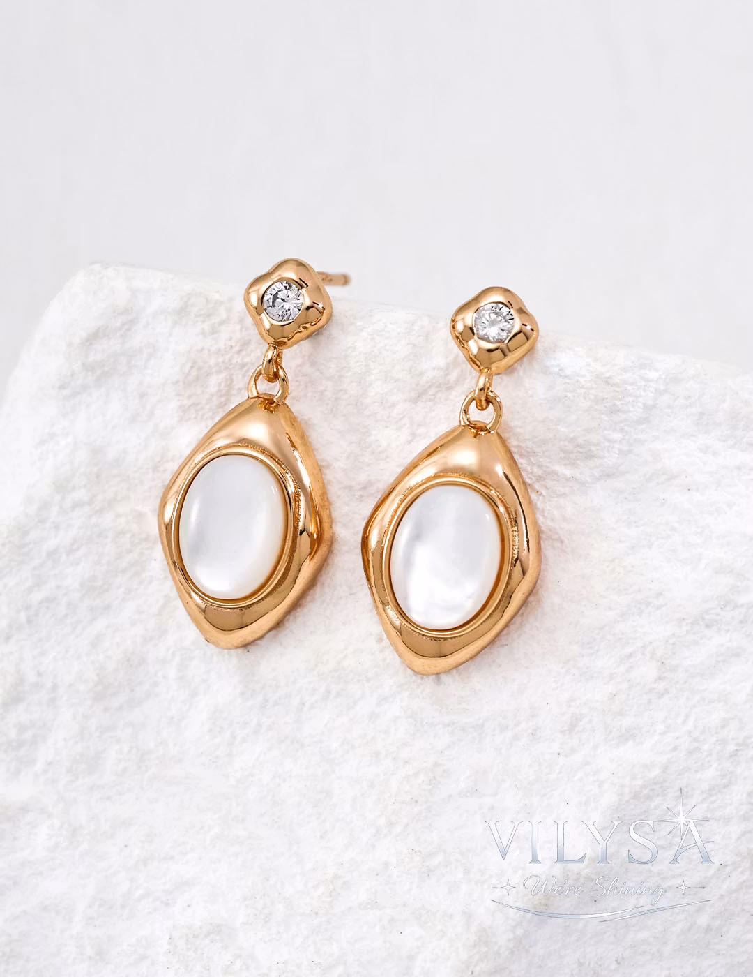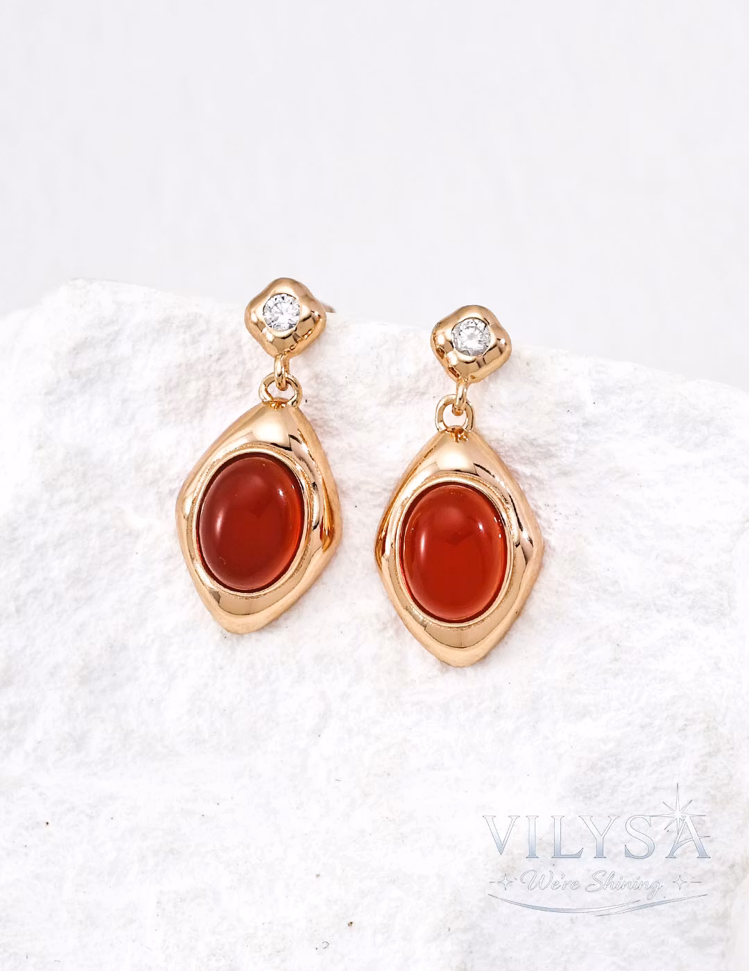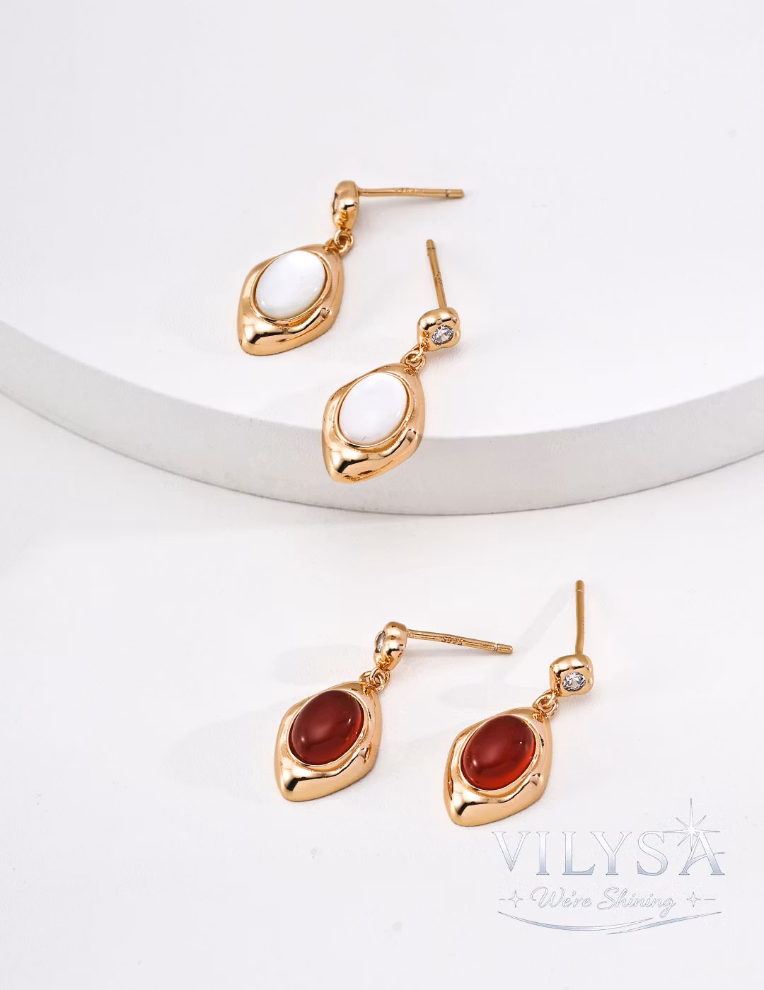 These elegant drop earrings are defined by an organic, freeform bezel that gently cradles your choice of a luminous white mother-of-pearl or a rich, deep red agate cabochon. The hand-sculpted frame highlights the unique character of each stone, while a single sparkling cubic zirconia set at the hook adds a subtle point of light.