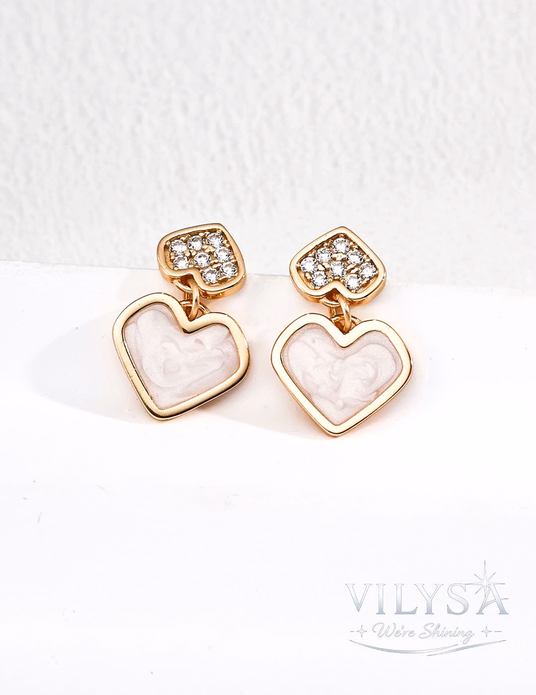 These charming drop earrings begin with a sparkling cubic zirconia-set top, from which dangles a sweet heart-shaped drop, filled with either soft pink or elegant marbled white enamel. The contrast between the brilliant stones and the smooth, colorful heart creates a look that is both playful and polished.