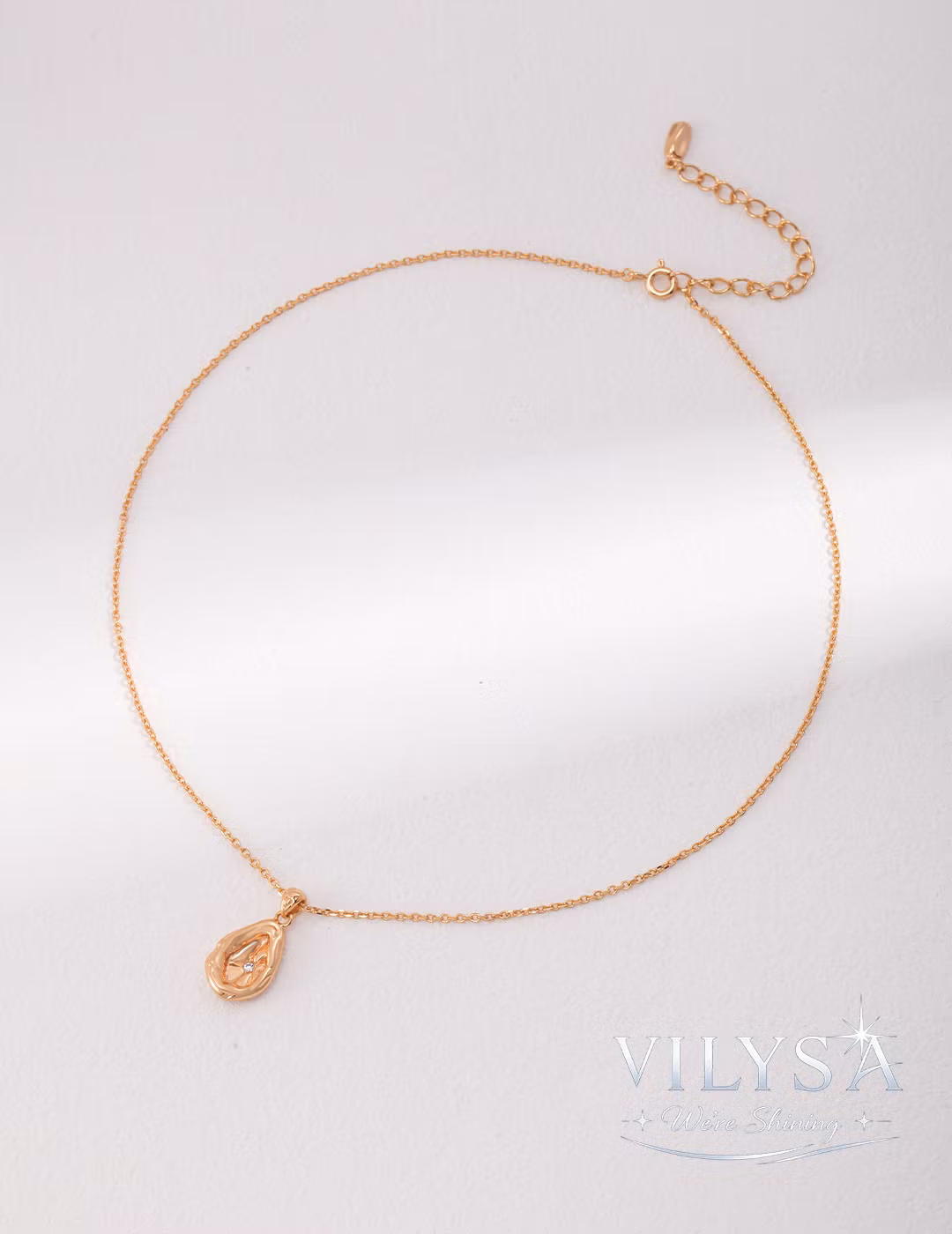 This elegant necklace centers on a captivating teardrop-shaped pendant, its surface adorned with a unique textured design and inlaid with a tiny, sparkling zirconia. Suspended from a delicate polished chain, the pendant’s sleek metallic finish catches and reflects light with every subtle movement.