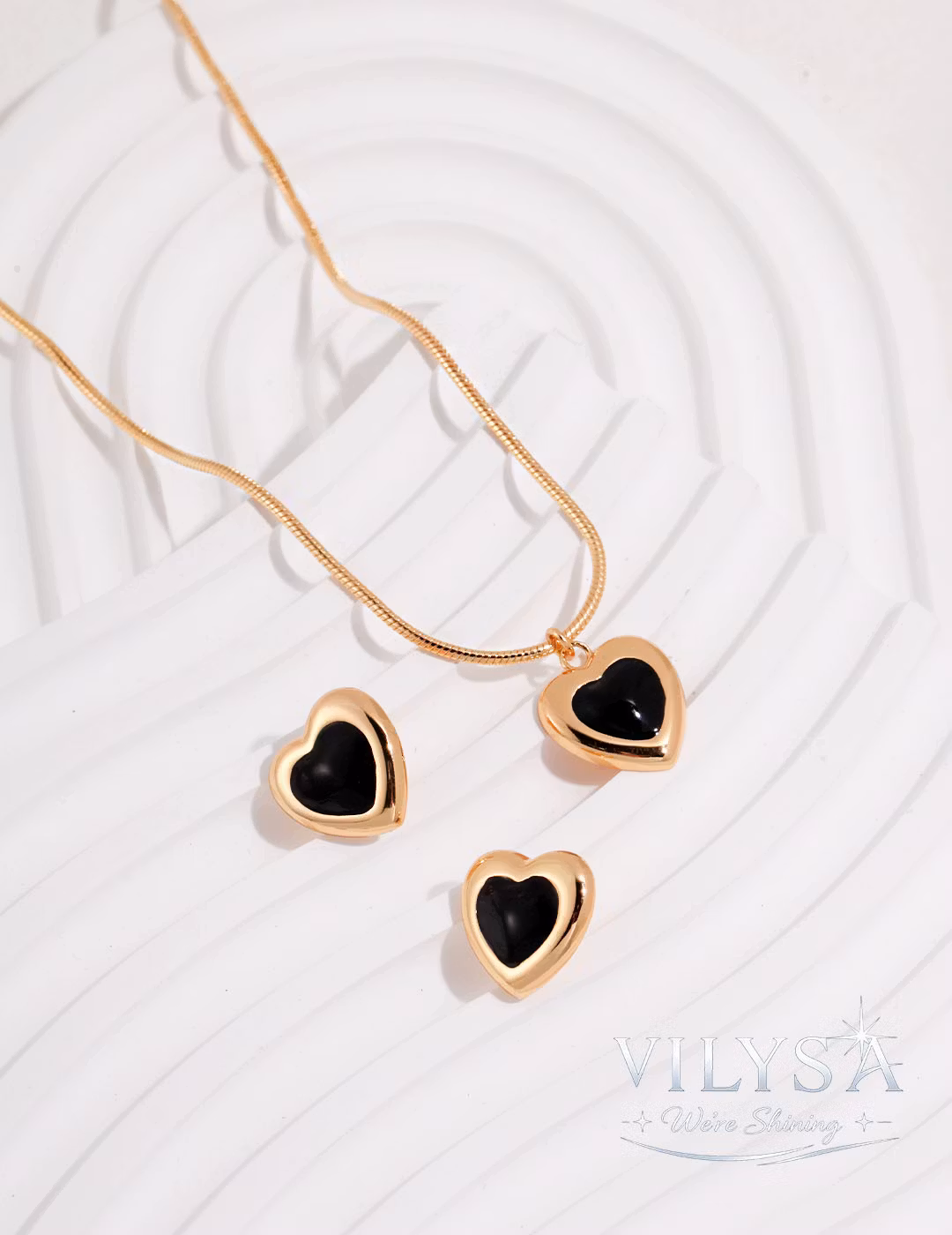 This elegant necklace features a sleek snake chain that leads to a captivating heart-shaped pendant, smoothly inlaid with deep black agate. The glossy stone catches the light with subtle reflection, creating a striking yet refined contrast against the polished metal.