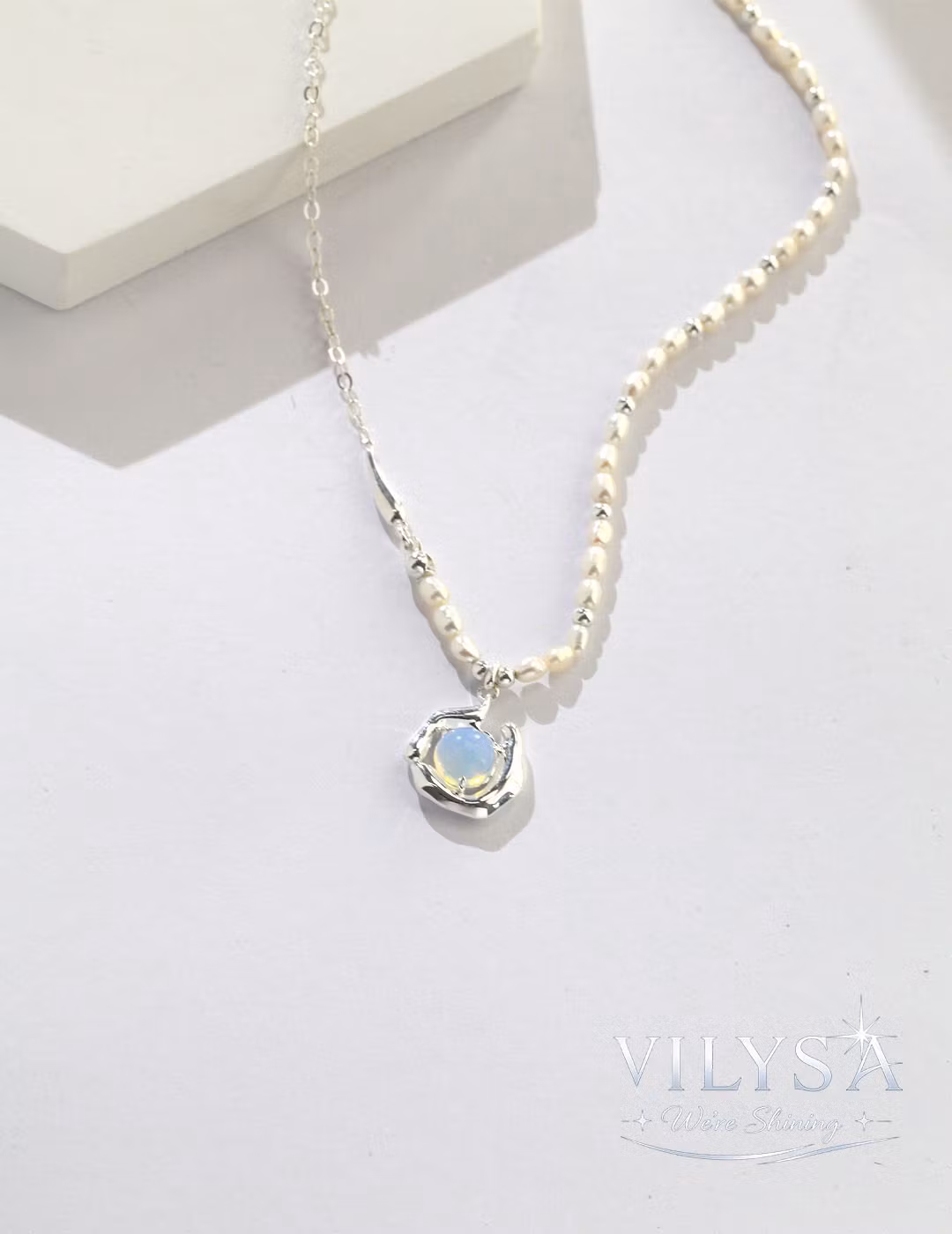 This enchanting necklace centers on an 8mm opal cabochon, its translucent, azure glow reminiscent of a serene mountain lake. The gem is embraced by an organic, fluid S925 silver setting, whose sculpted, irregular lines rise like protective ridges encircling a hidden sanctuary.