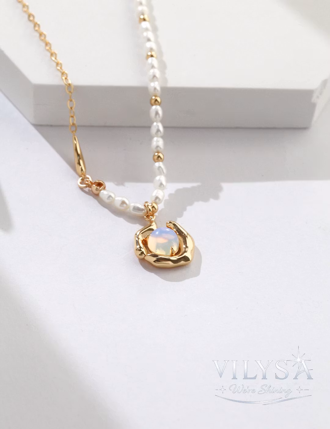 Handcrafted with intention. Each opal’s unique play-of-color and the hand-sculpted metal frame ensure your necklace is a one-of-a-kind tribute to nature’s artistry.