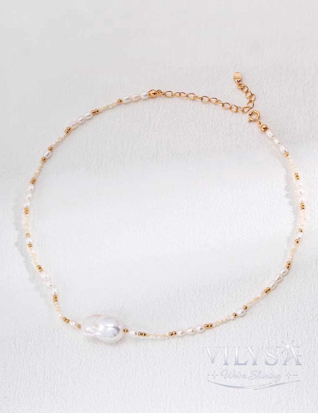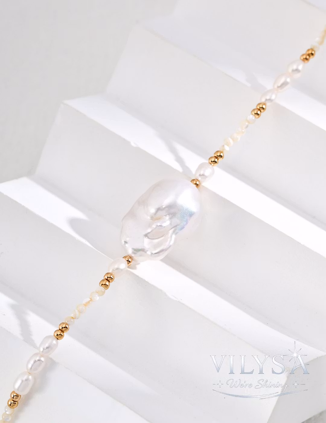 This delicate choker features a soft strand of tiny natural pearls and silver shell beads, their milky luminescence gently catching the light. At its heart rests a statement baroque pearl pendant—each one uniquely shaped by nature—creating a quiet, ethereal focal point that feels both timeless and deeply personal.