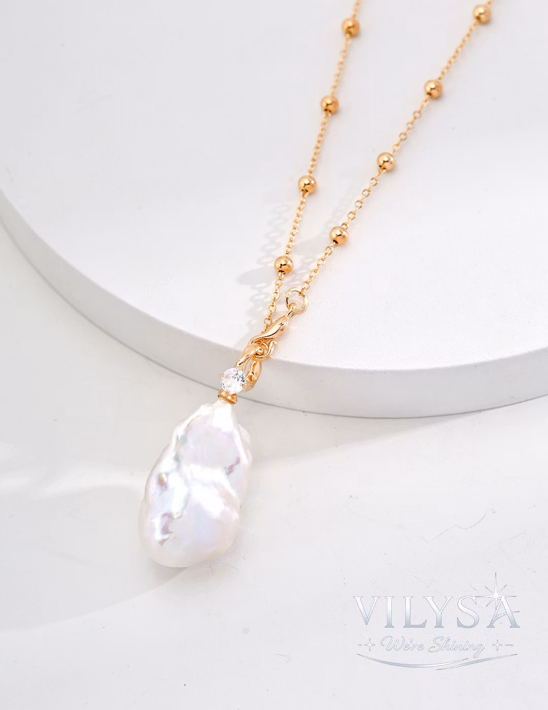The pearl is suspended from a delicate chain dotted with tiny gold beads, their warm glow echoing the stone's luminous tones. Above, a sculpted bail set with a single sparkling zircon catches light like a hidden star—a subtle accent that elevates the natural wonder without competing with it.