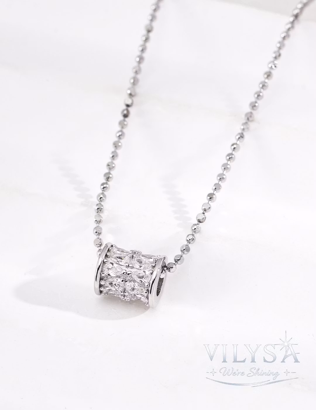 This modern, minimalist necklace centers on a sleek cylindrical pendant, meticulously paved with brilliant-cut cubic zirconia. The stones are set to create a continuous, radiant line of sparkle that captures light from every angle.