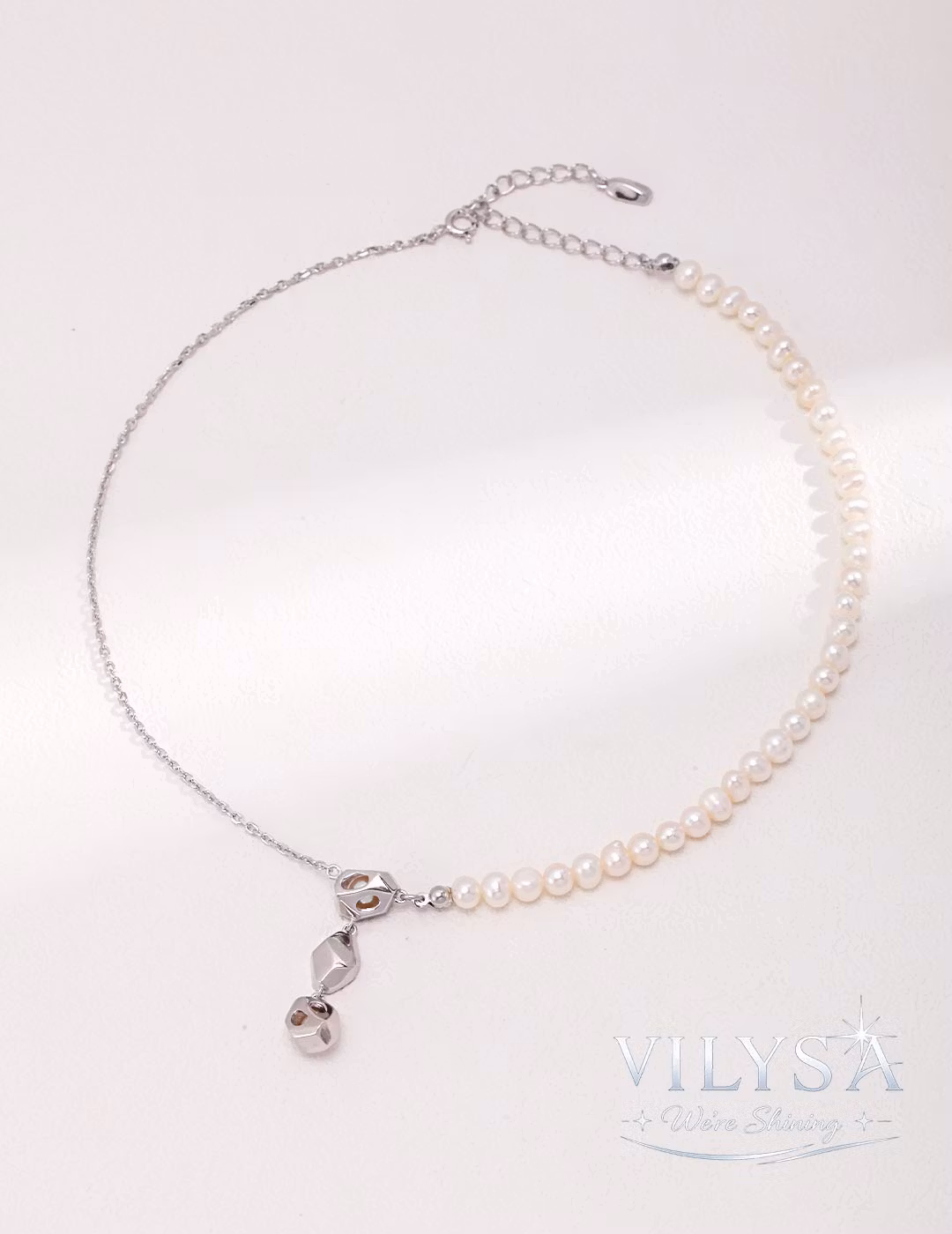 The Petal Cascade necklace combines a gentle row of dainty natural pearls with a sleek metallic chain, accented by a tiered, petal-shaped pendant set with luminous pearls. This design creates an elegant, flowing silhouette that moves with grace and intention.