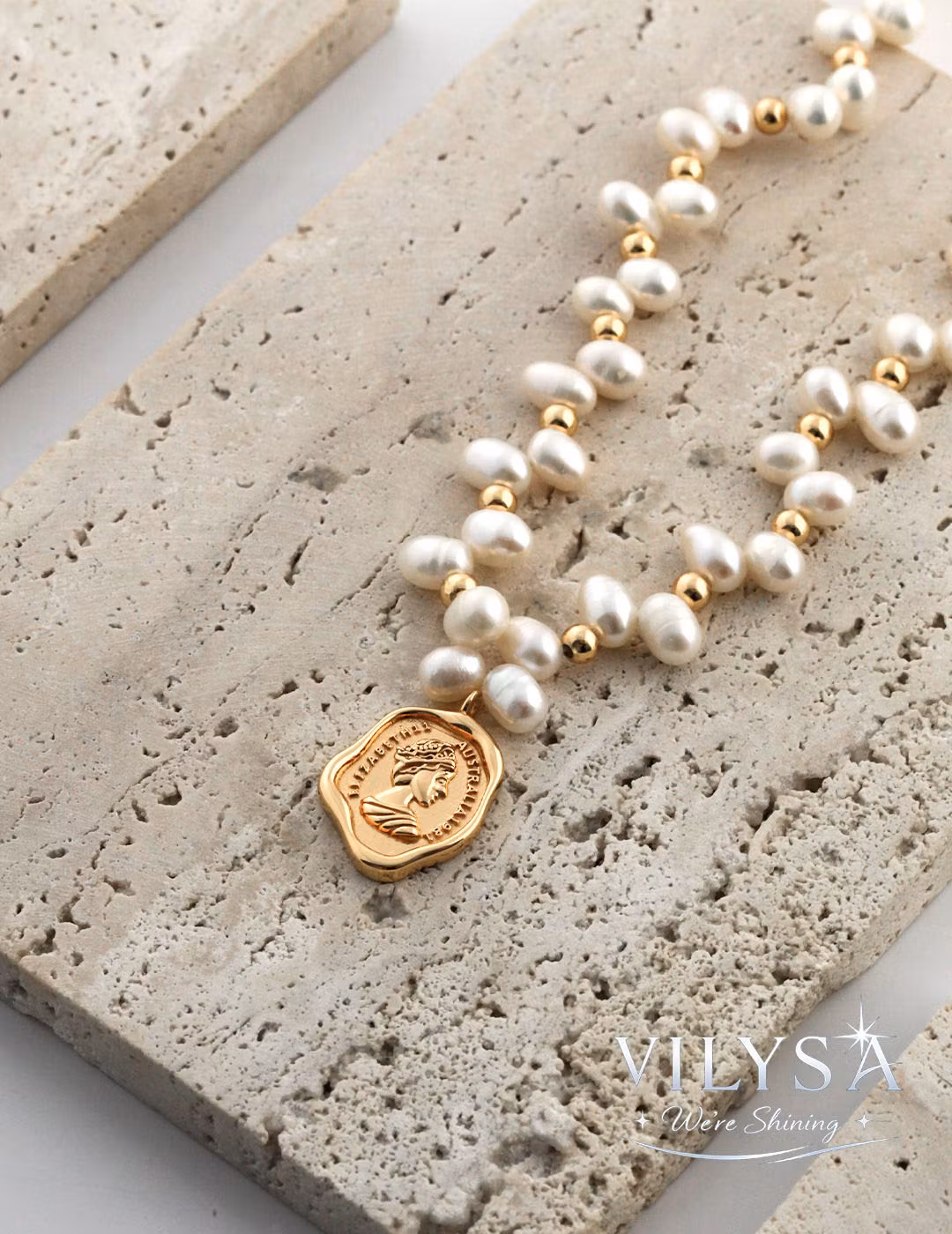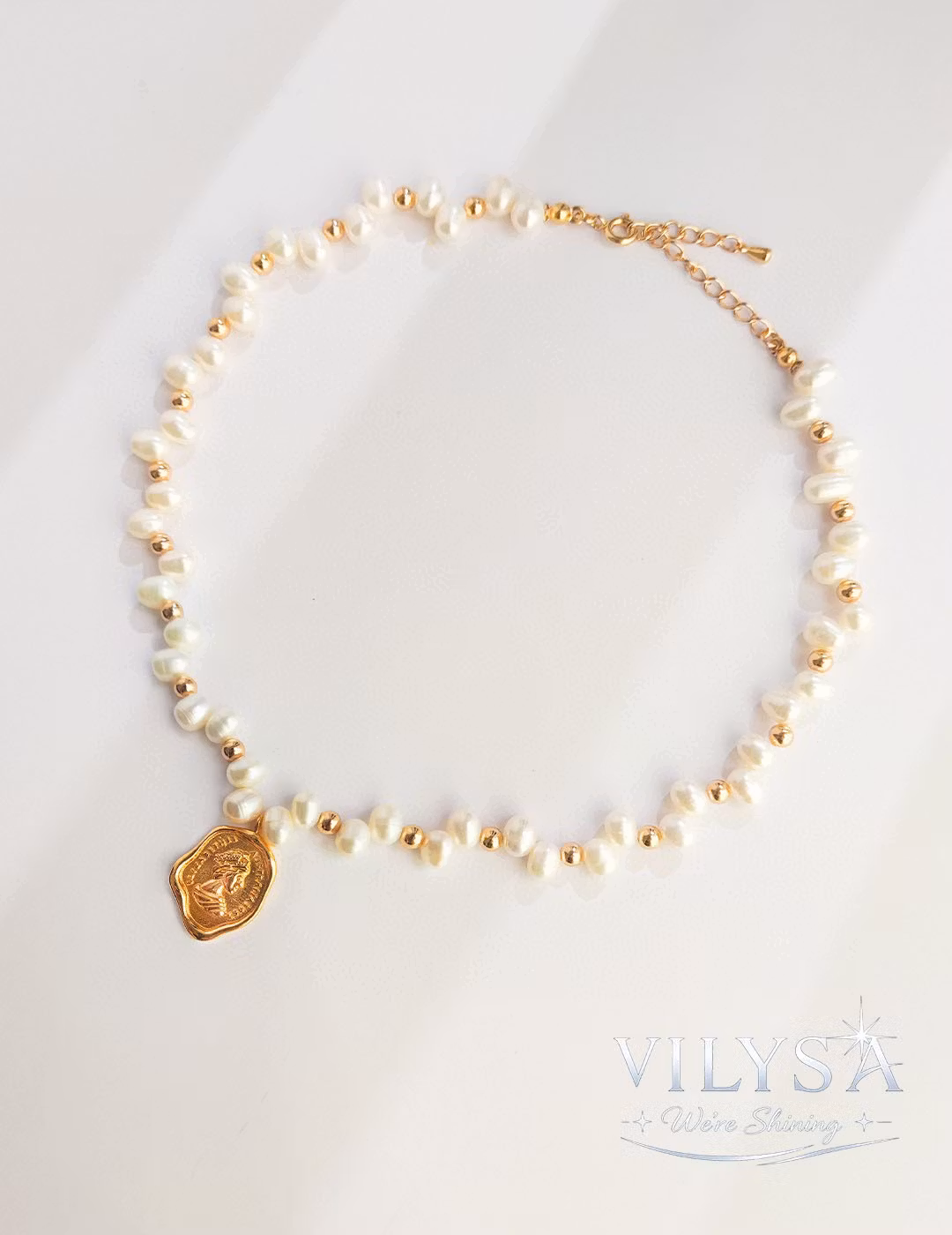 At its center lies a sculpted “wax seal” pendant, bearing a regal queen motif with dimensional depth and an organic, irregular edge. This tactile focal point transforms the classic pearl necklace into a wearable work of art—striking yet understated, perfect for those who appreciate timeless elegance with a narrative touch.