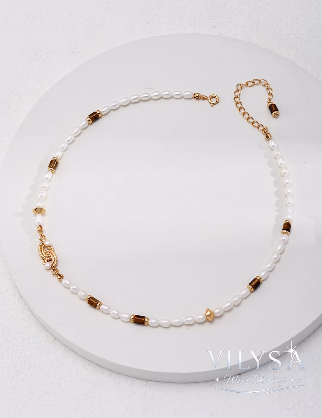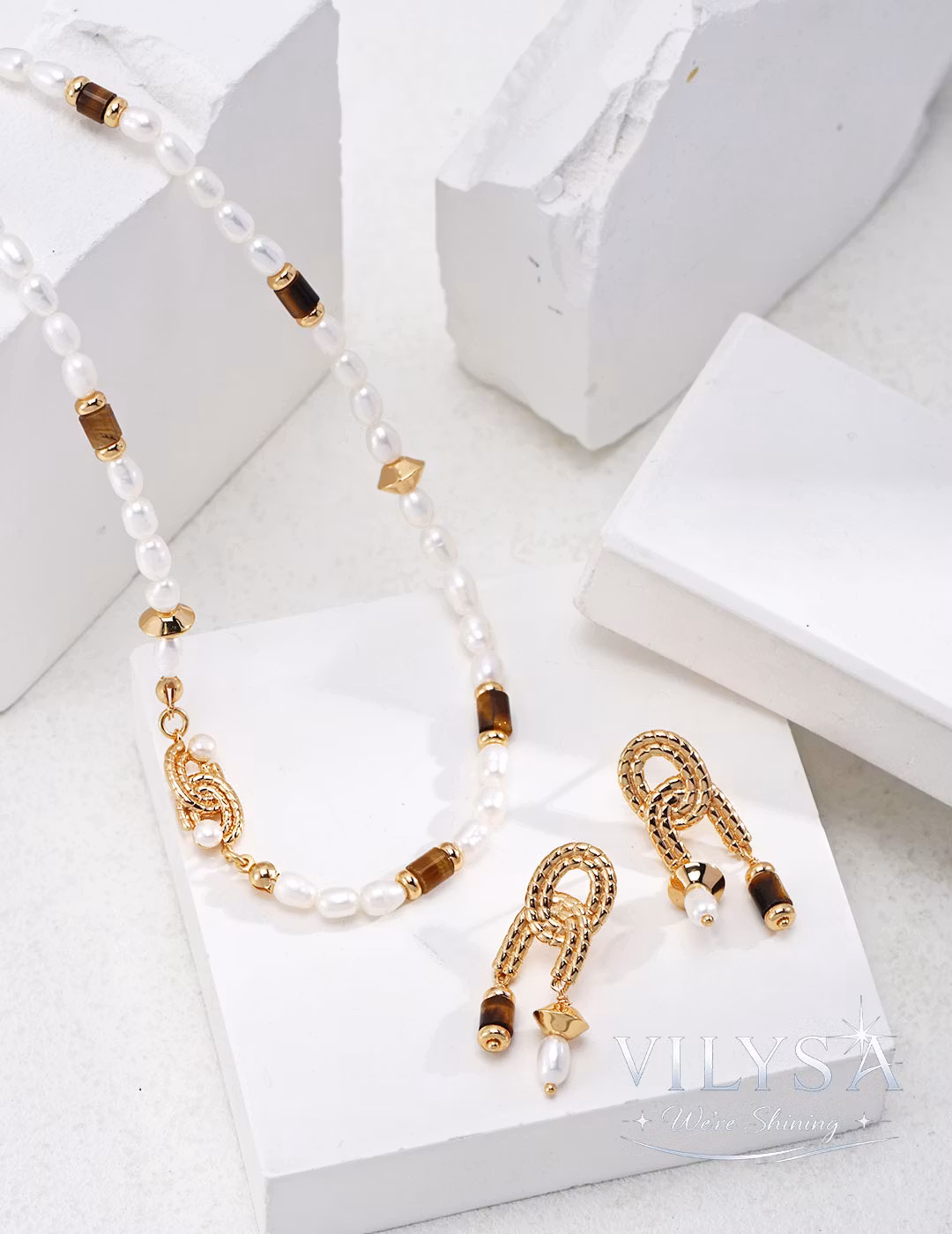 The Retro Knot necklace is a study in woven elegance. It artfully combines creamy natural pearls, warm tubes of tiger’s eye, and a central vintage-inspired gold knot charm, creating a piece rich in texture and timeless appeal.