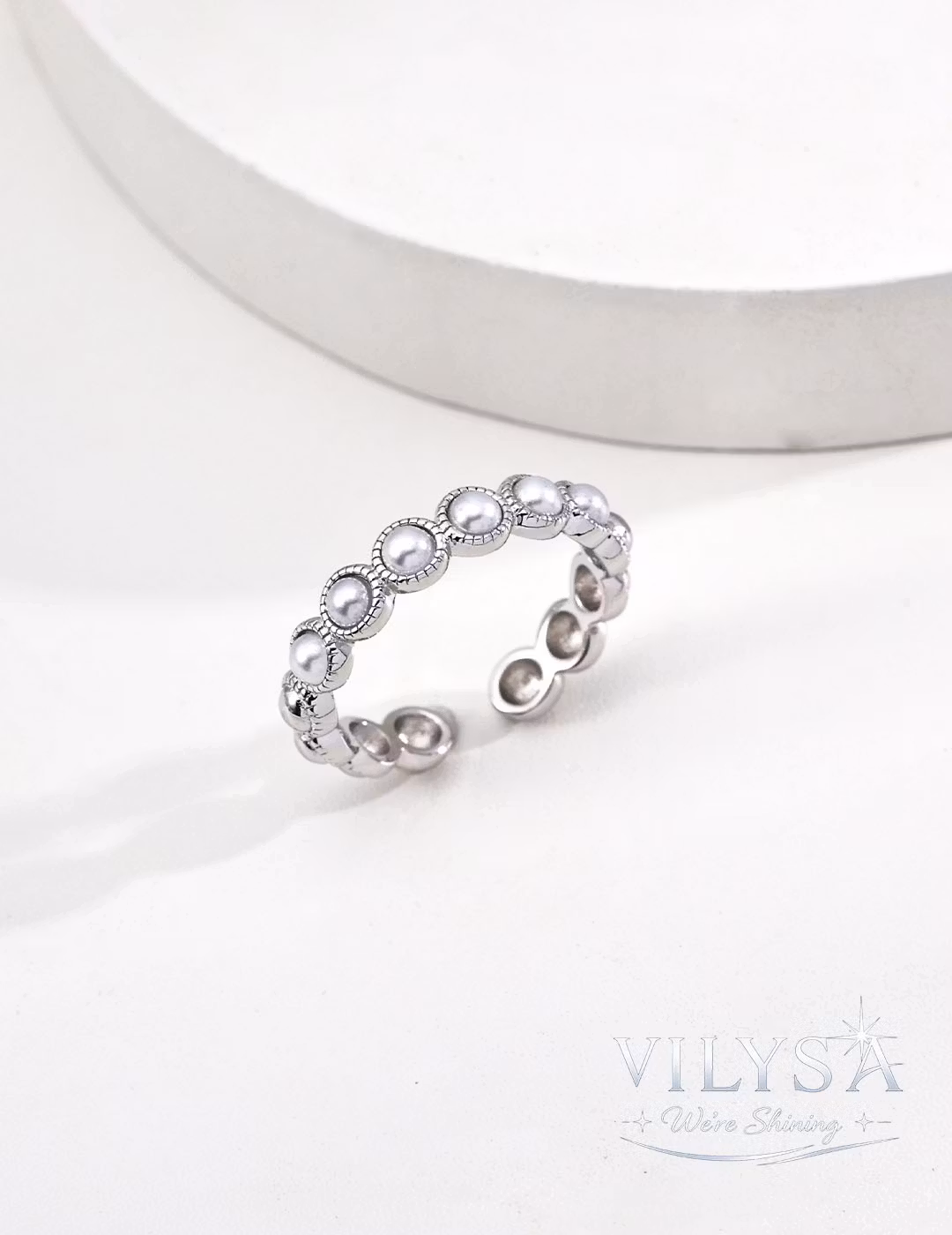 This delicate open ring is a study in soft radiance. A continuous band of luminous imitation pearls is arranged in quiet procession, each tiny sphere framed by a handcrafted milgrain bezel. The textured border catches light in subtle bursts, creating a gentle halo effect that makes each pearl appear to glow from within.