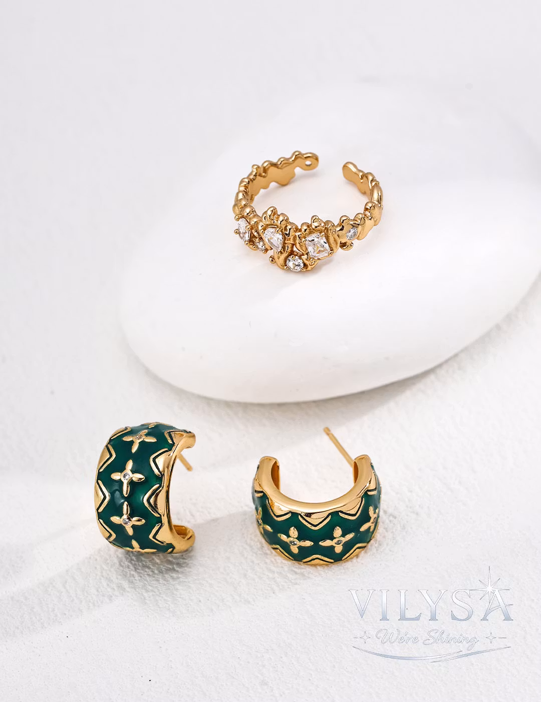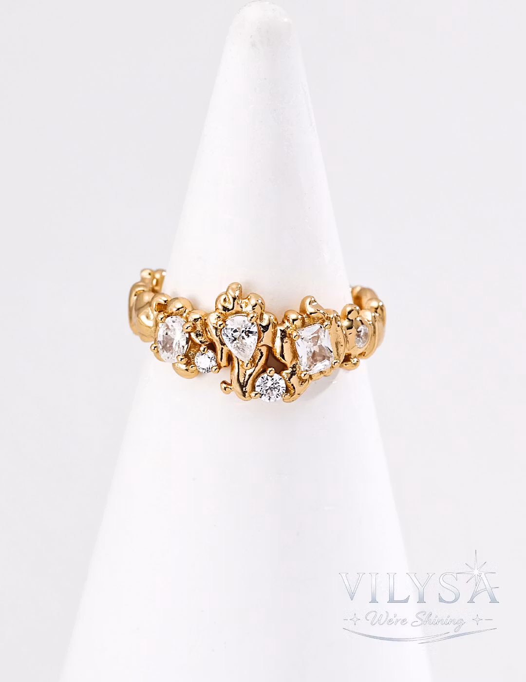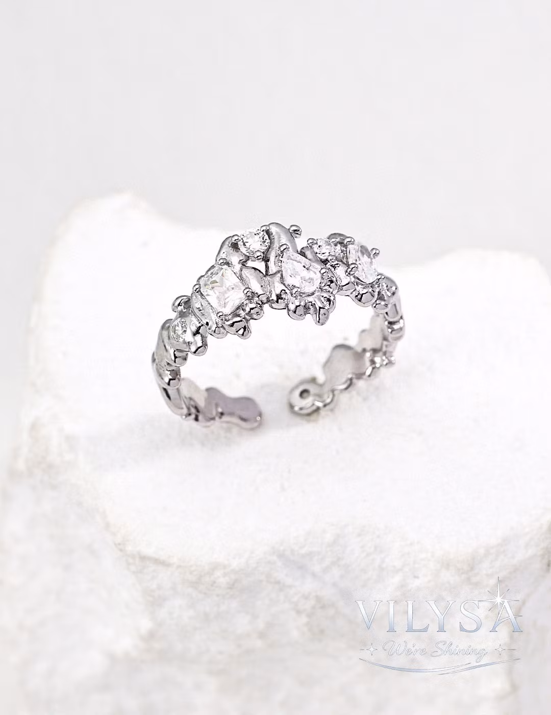 This captivating open ring captures the restless energy of cooling lava. Its band flows with an organic, uneven texture—rippled, pitted, alive with the memory of heat and movement. Within this fluid metal landscape, clusters of sparkling cubic zirconia emerge like crystallized light, as if fragments of brilliance have been caught mid‑flow and frozen in time.