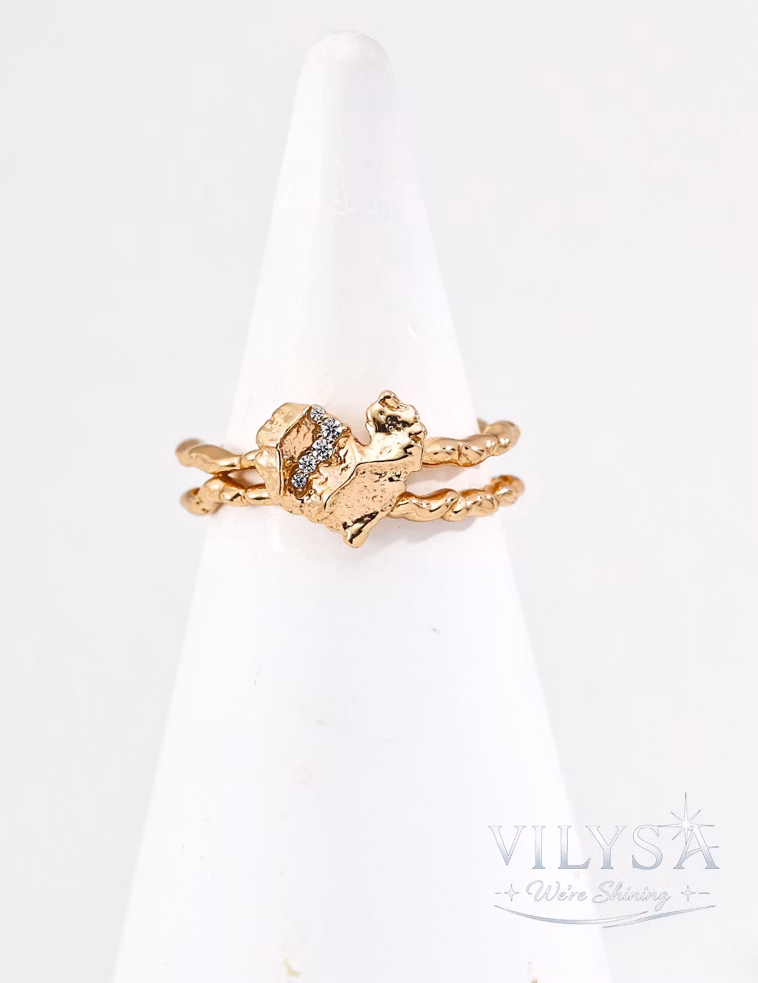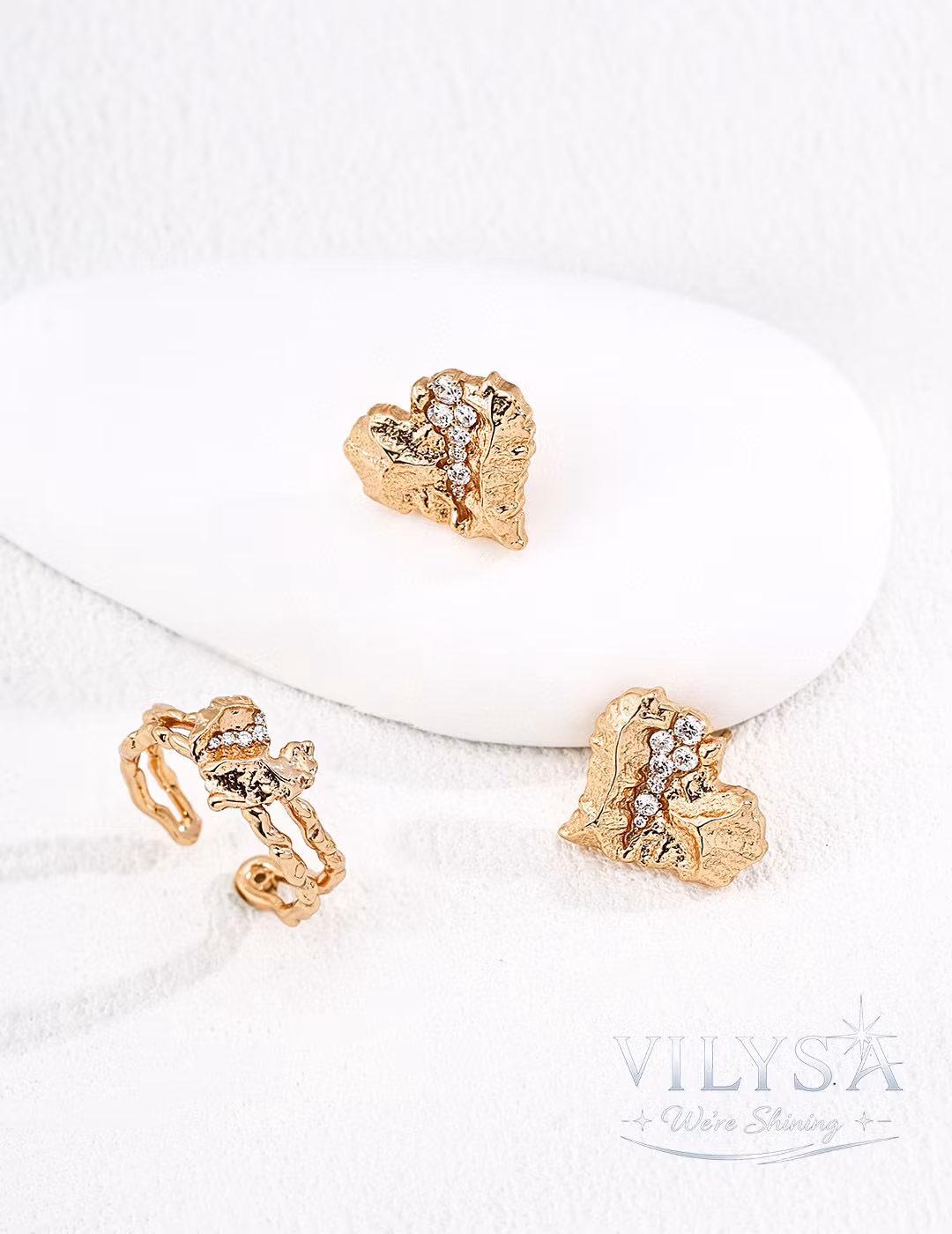 Each ring is finished to preserve the organic irregularity of its cracked texture. The placement of each zircon reflects the natural spontaneity of crystallized light—no two hearts reveal their brilliance in quite the same way.