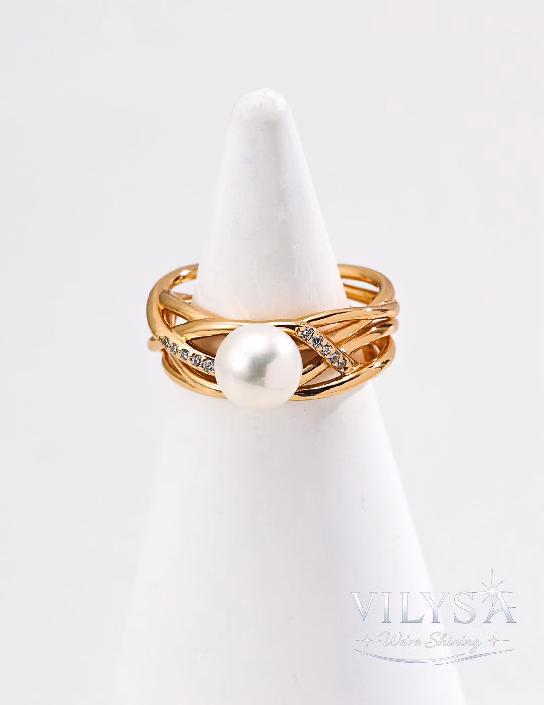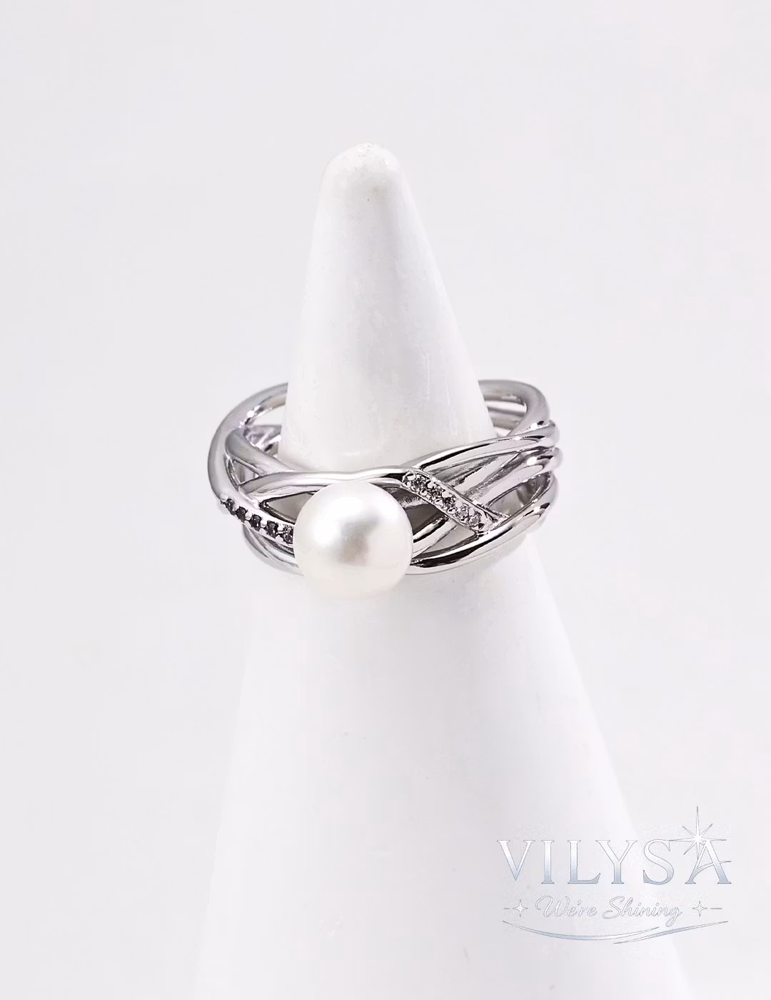 Embedded along these celestial pathways, sparkling cubic zirconia pulse with captured light, like stars frozen in their eternal dance. And at the center, suspended in radiant stillness, a single 8mm natural pearl glows with the soft, steady warmth of a guiding moon.