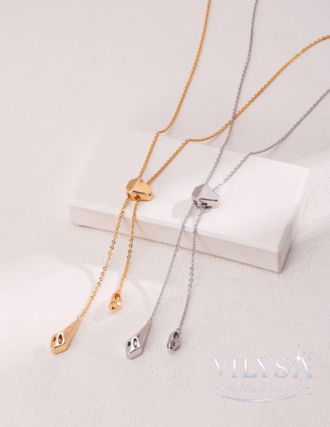 Slide Charm redefines versatility with its sleek, adjustable drawstring design and irregular geometric pendants. This modern long chain blends minimalist sculptural beauty with effortless, wearable elegance—a piece that moves with you and for you.