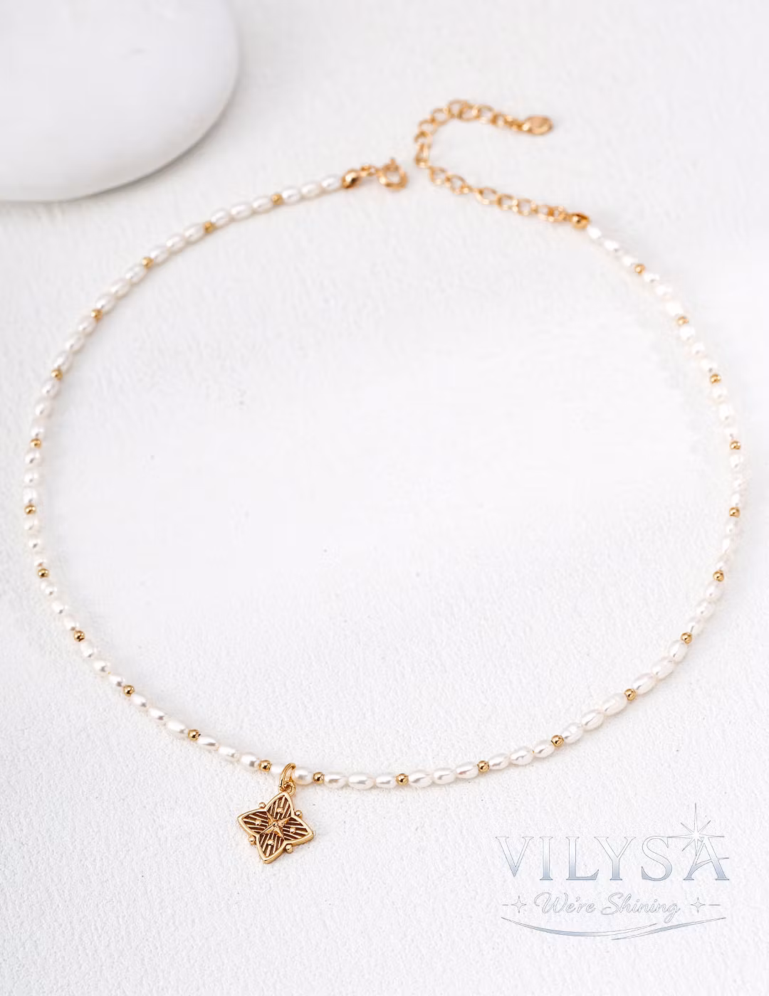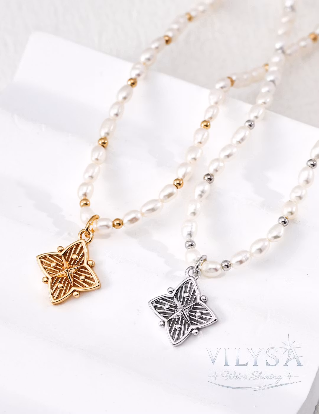 This necklace weaves together the dual symbolism of luck and radiance. A delicate, openwork clover pendant—adorned with a central cross-star motif—hangs gracefully from a strand of luminous 3–4mm natural pearls, creating an ethereal and meaningful silhouette.