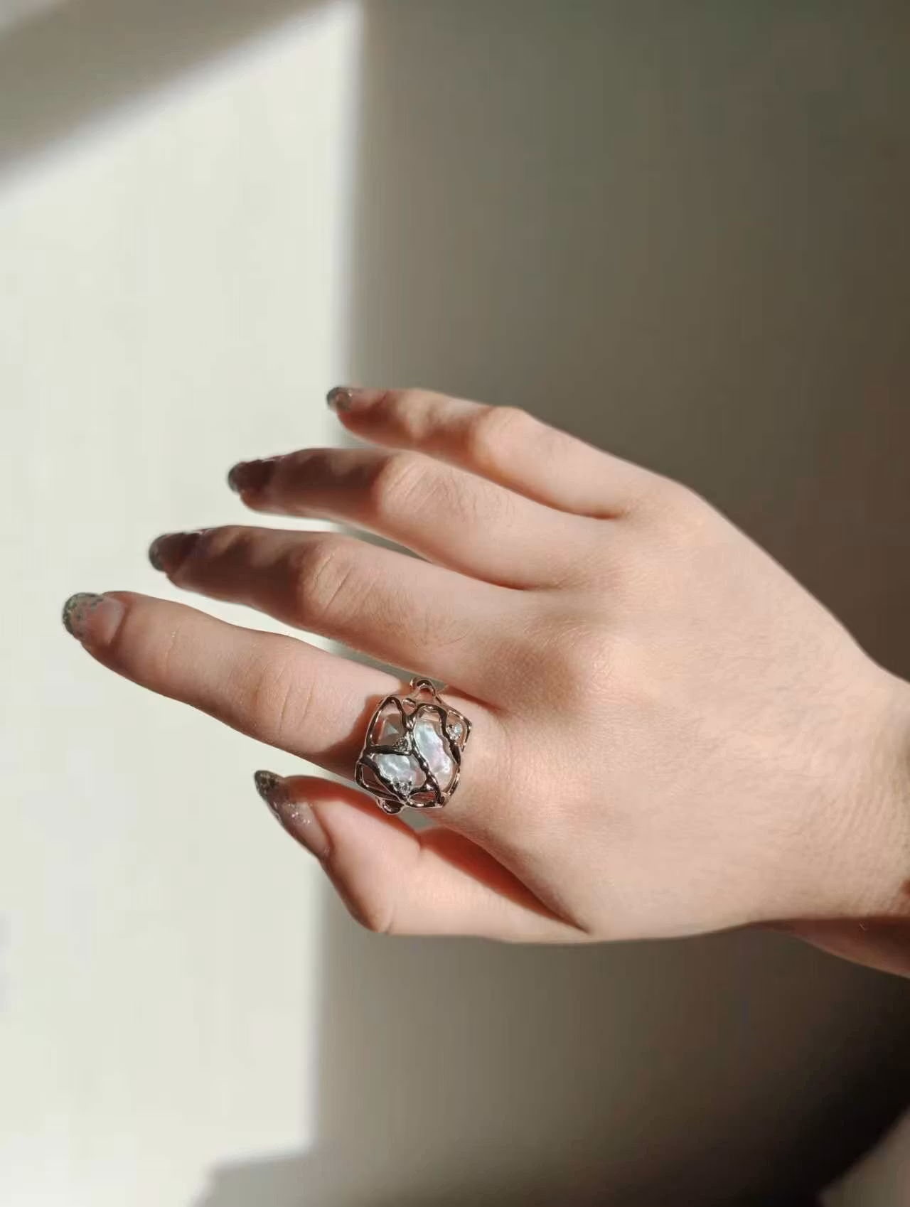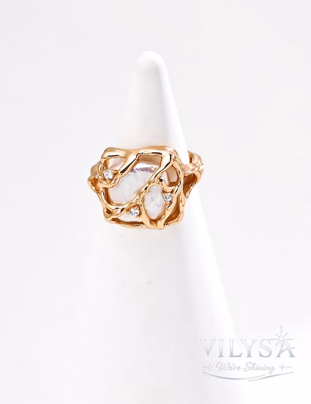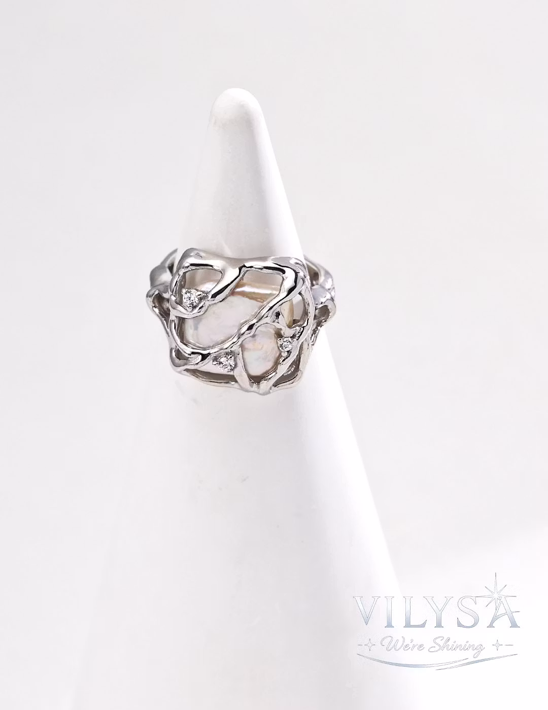 This ring is a celebration of beauty held sacred—a luminous baroque pearl cradled within an intricate, web-like sanctuary of polished metal. The delicate framework does not confine; it protects, encircling the pearl like a treasured secret kept close to the heart. Tiny zircon accents scattered throughout catch the light like morning dew on a spider's web, adding whispers of brilliance to the composition.