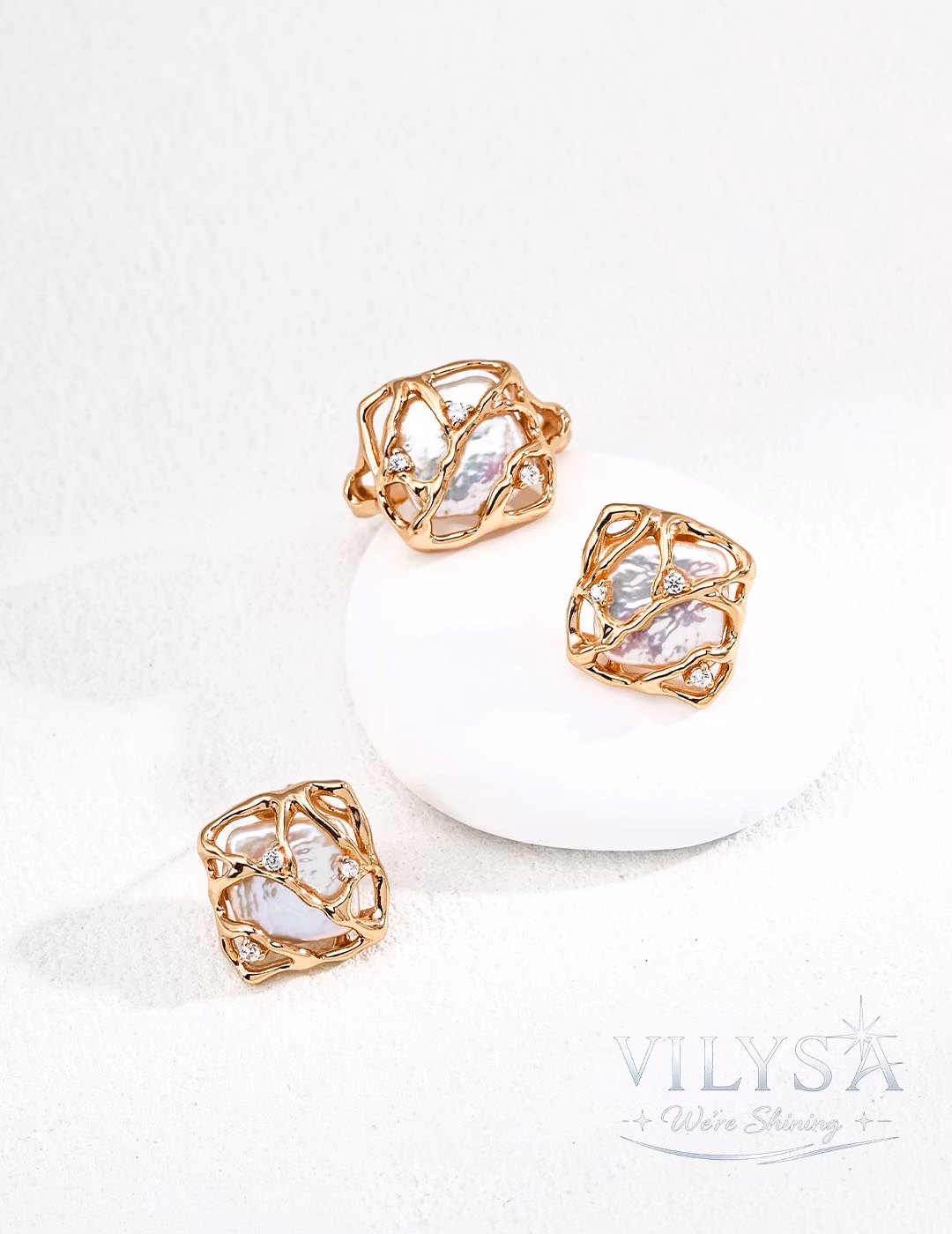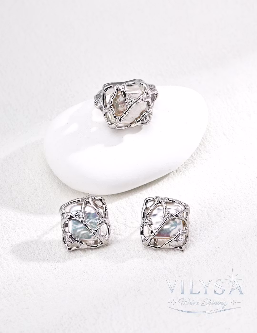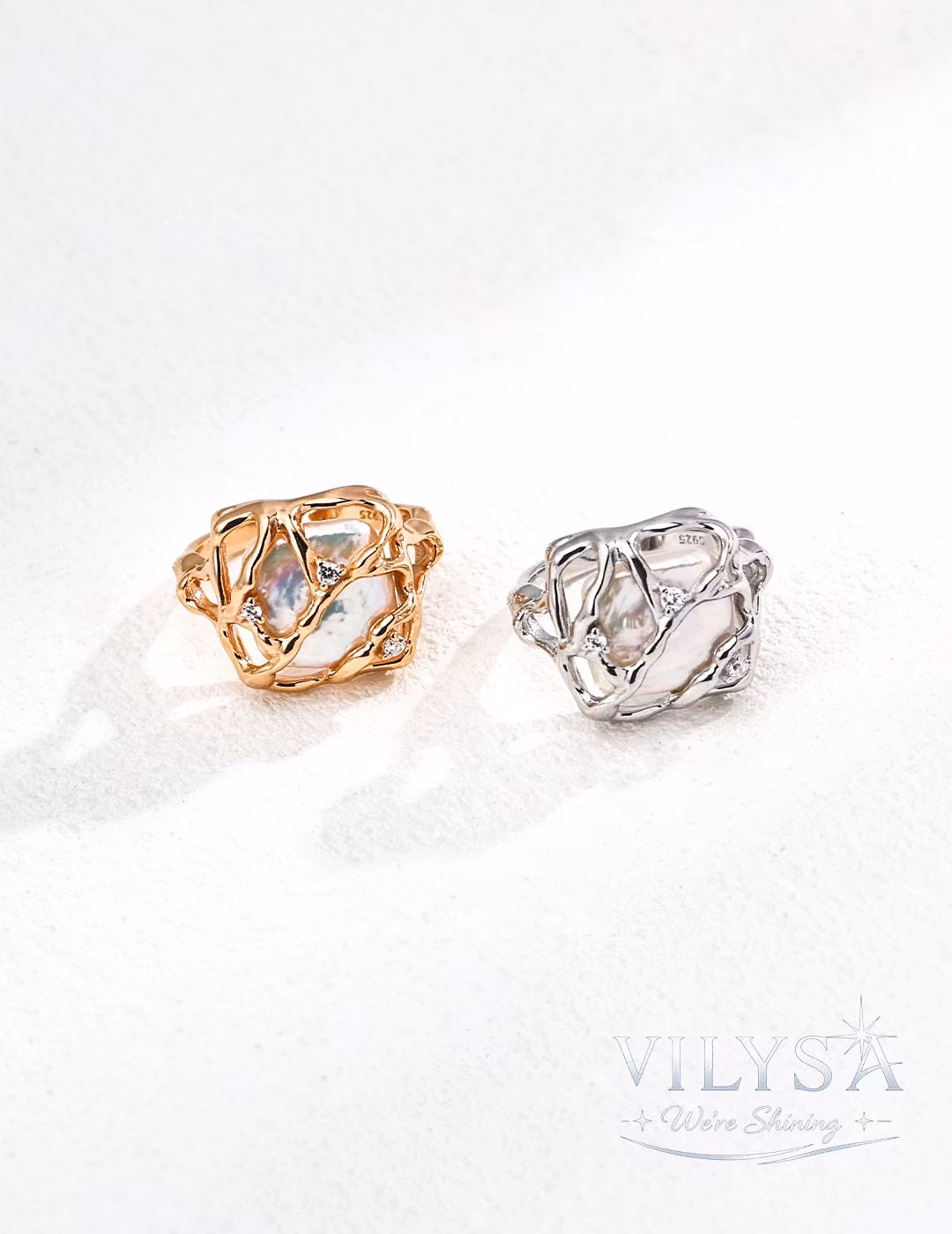 This ring is a celebration of beauty held sacred—a luminous baroque pearl cradled within an intricate, web-like sanctuary of polished metal. The delicate framework does not confine; it protects, encircling the pearl like a treasured secret kept close to the heart. Tiny zircon accents scattered throughout catch the light like morning dew on a spider's web, adding whispers of brilliance to the composition.