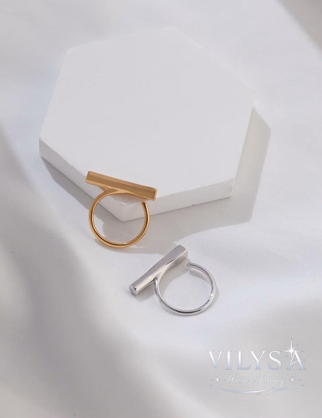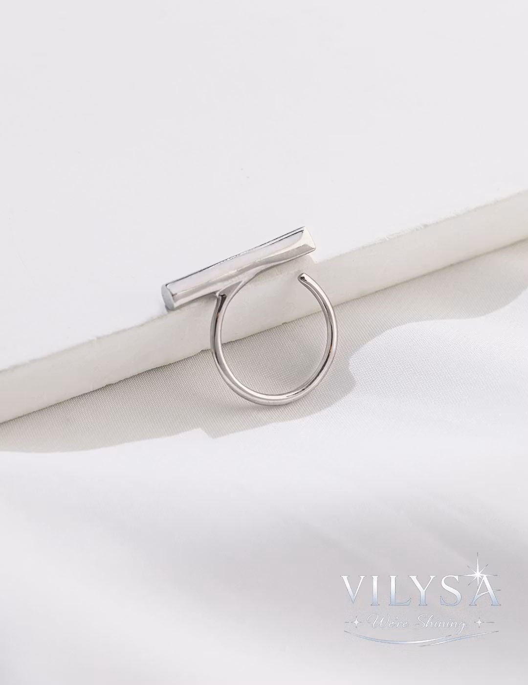 This ring transforms geometric purity into a wearable study of balance and form. Its design is a deliberate dialogue between two distinct shapes—a clean, rectangular bar meets a continuous circular band, intersecting in quiet tension. The result is a modern, sculptural silhouette that rests on the finger like a fragment of contemporary architecture, minimal yet commanding.