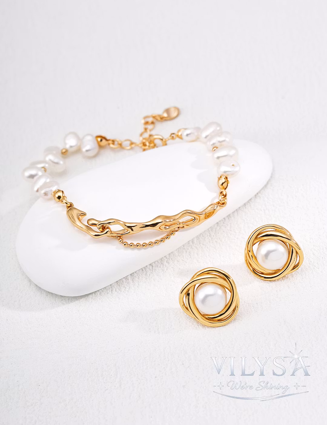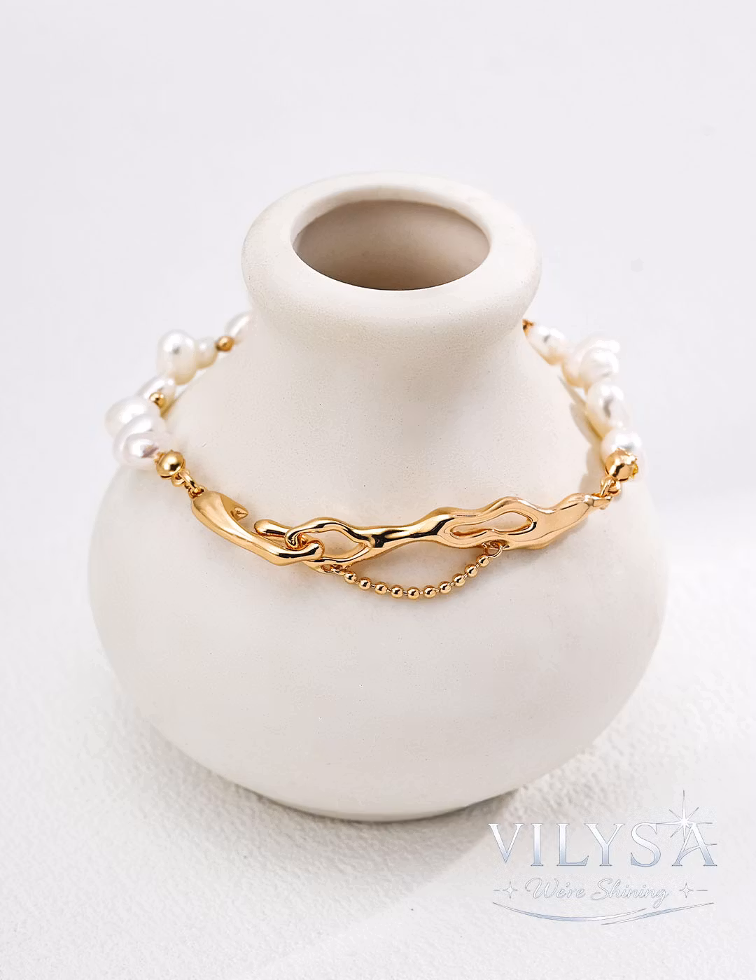 This adjustable bracelet celebrates the quiet poetry of imperfection. Lustrous baroque pearls—each one irregular, unique, and naturally formed—are strung in a gentle rhythm alongside a sculptural, organic-shaped metal bar. The bar's fluid, textured surface, finished in warm antique gold, echoes the soft curves of the pearls while offering a deliberate counterpoint of structure and solidity.