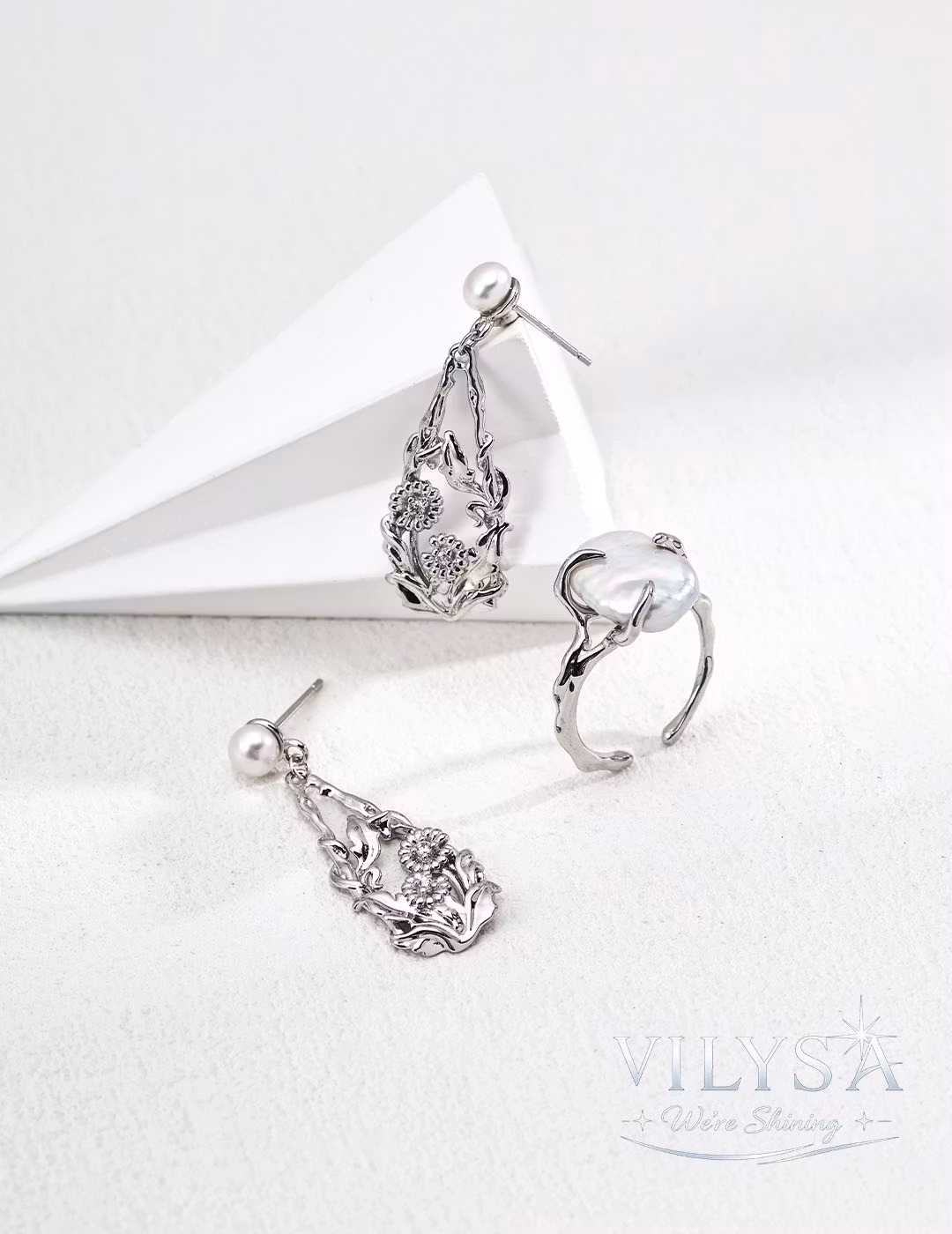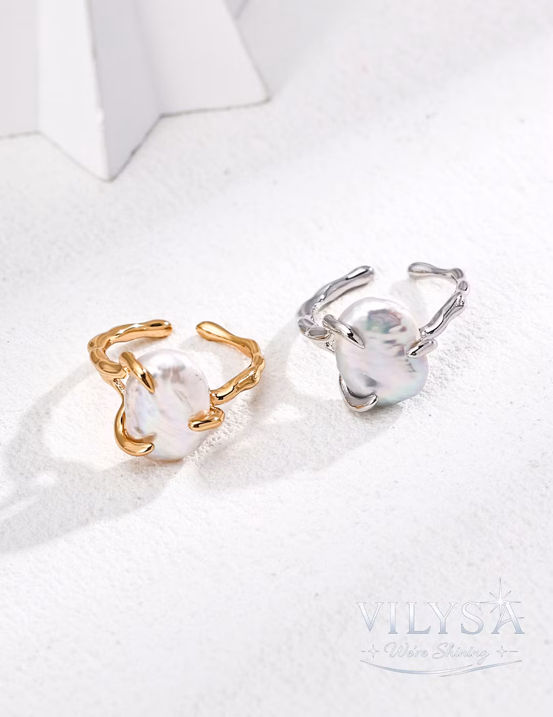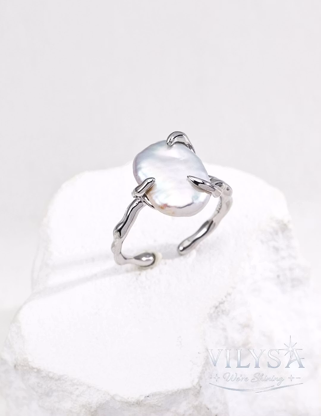 This ring is a love letter to the beauty of imperfection. At its heart rests a baroque pearl—irregular, luminous, and utterly unique—cradled within a sculpted band that curves and flows like a branch shaped by wind and time. The pearl's organic form catches light in unexpected ways, its surface a landscape of soft shadows and gentle glow.