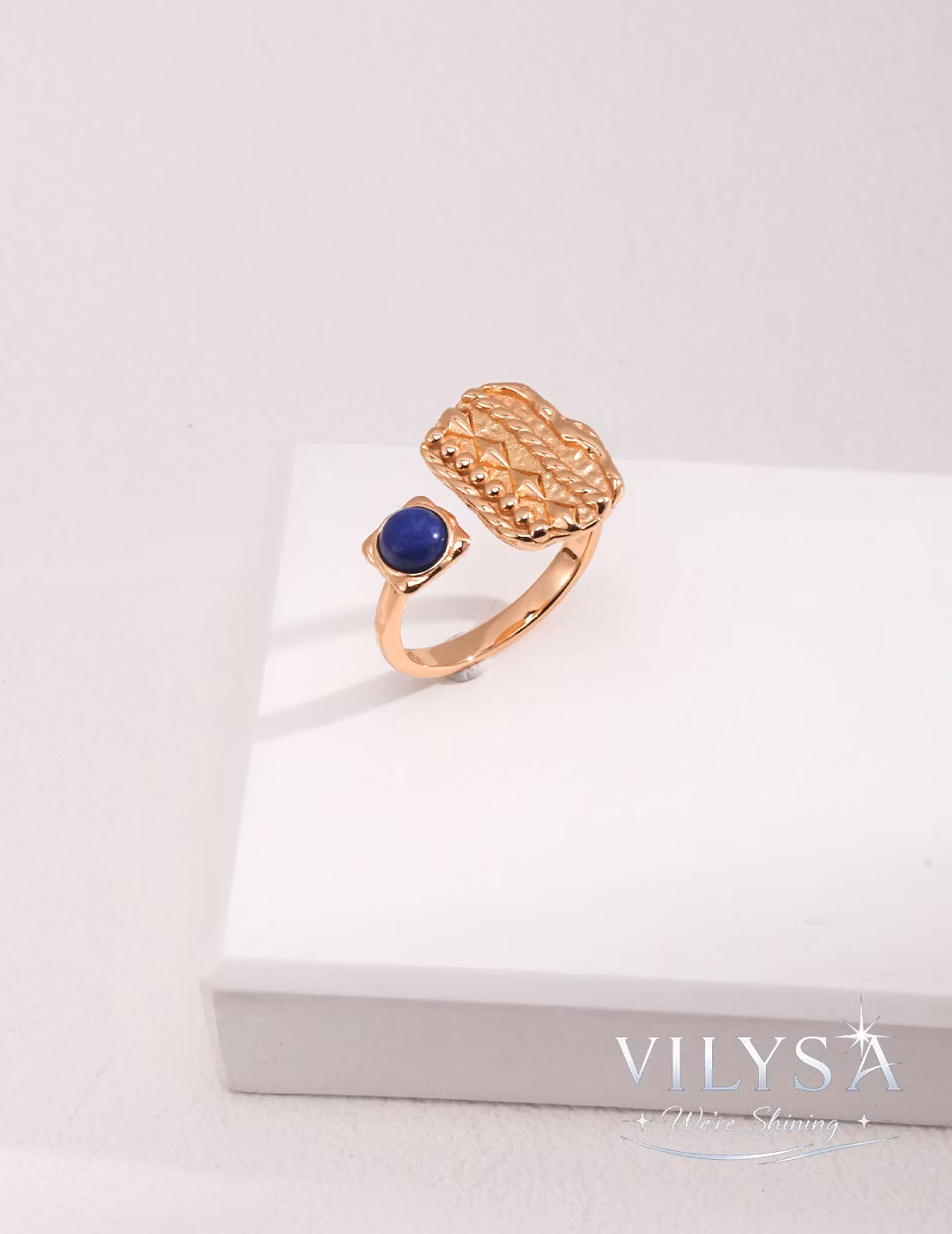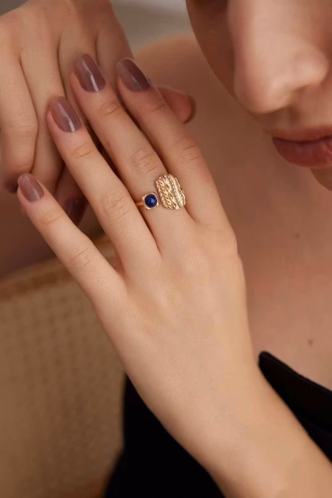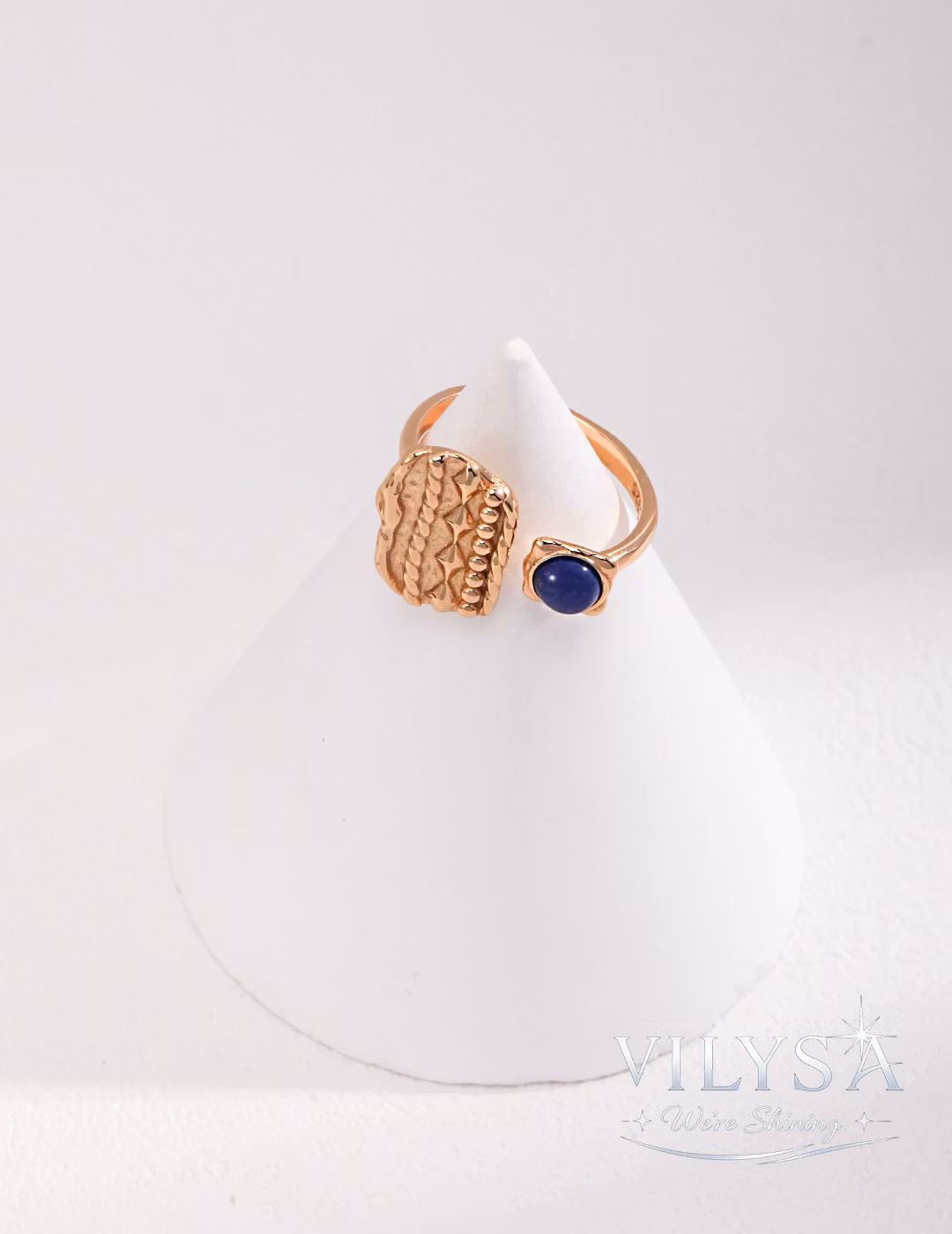 This open ring balances bold texture with quiet refinement. Its wide, sculptural panel is adorned with intricate braided and beaded details—each ridge and sphere catching light in soft succession, evoking the meticulous ornamentation of heirloom treasures. Set within a delicate frame at the center, a deep blue lapis lazuli cabochon glows with celestial richness, its surface flecked with golden pyrite like a fragment of ancient night sky.