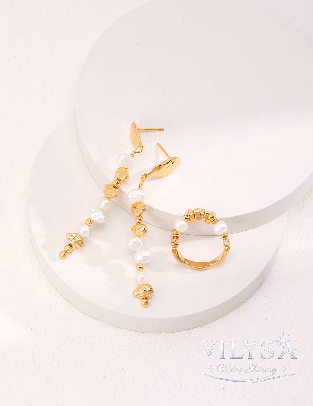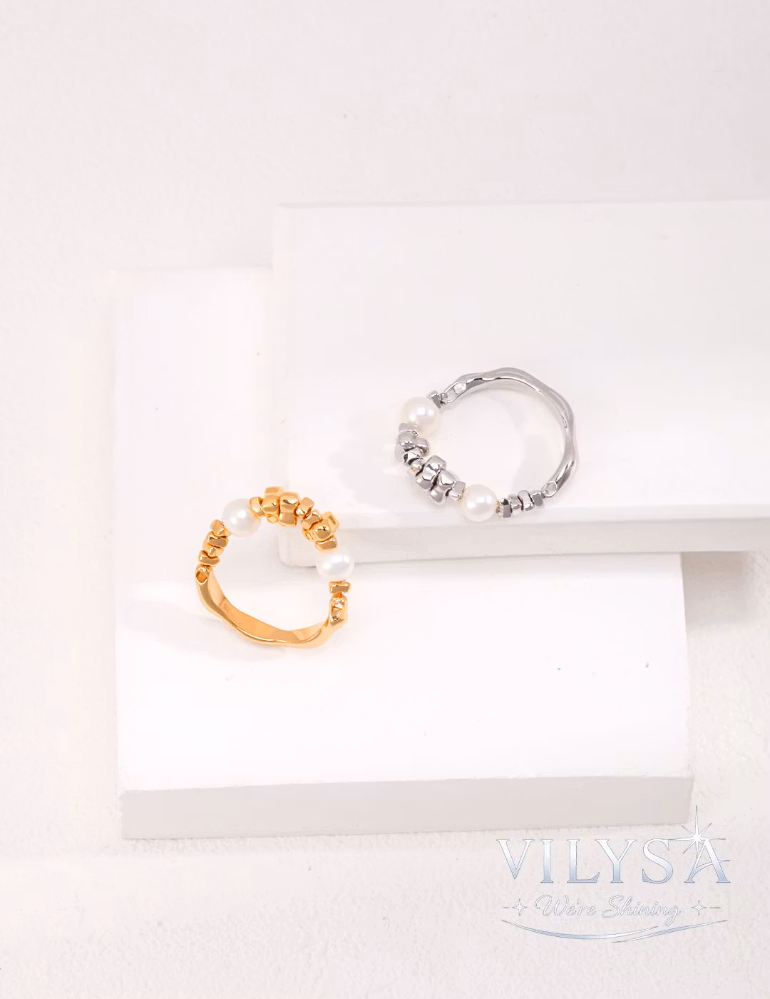Each ring's fragment arrangement is precisely composed to create a balanced rhythm of texture and light. The natural pearls are selected for their even, serene luster—a modern meditation on the beauty of contrast and imperfection.