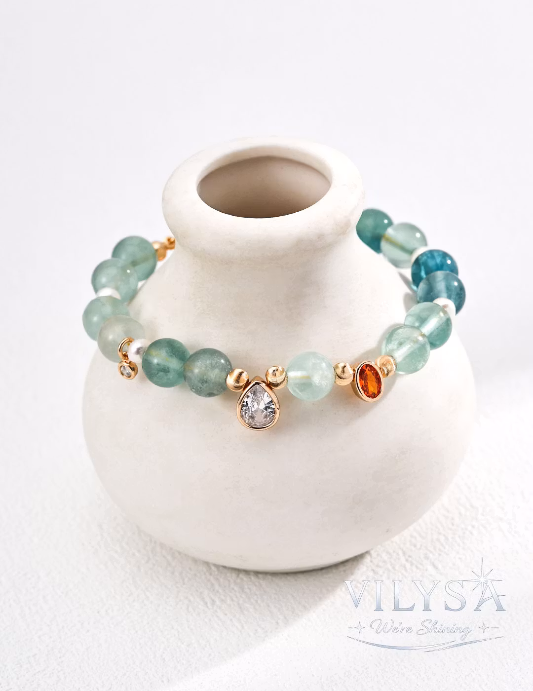At the center, two distinctive accents add unexpected personality: a teardrop-shaped clear zircon catches light with brilliant precision, while a warm orange gemstone pendant offers a pop of vibrant contrast. Together, they reveal an extraordinary attention to detail within the bracelet's minimalist framework.
